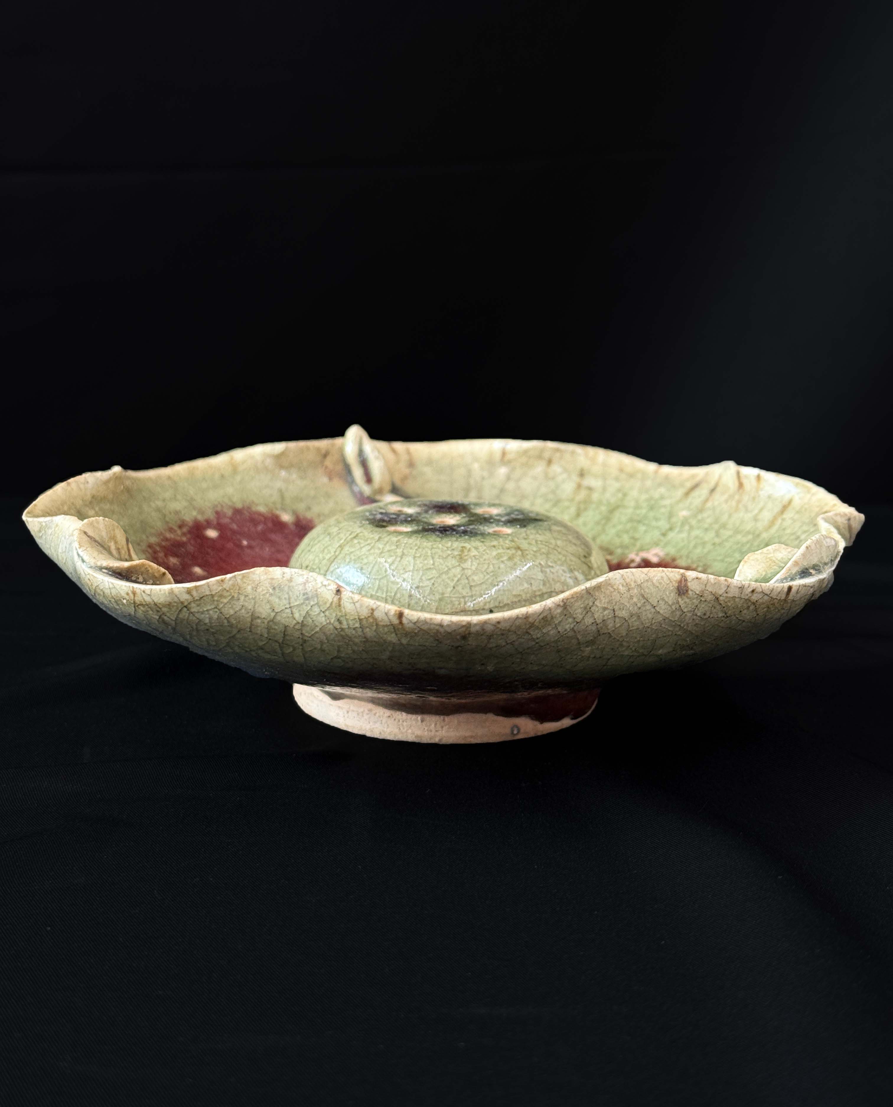 仿生莲花葵口造型,口沿呈六瓣莲花形态,边缘饰凸起莲苞纹,中心为带烛孔的圆形烛座,烛孔均匀分布以固定烛芯,整体线条柔美舒展。