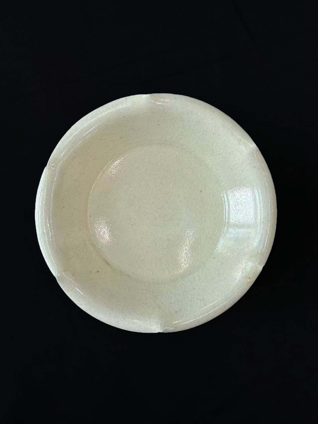 口沿弧度柔美,盘壁斜度舒缓,圈足修削规整,釉色呈温润的米黄色,釉面带有细碎的自然开片纹。仅供参考 自行甄别