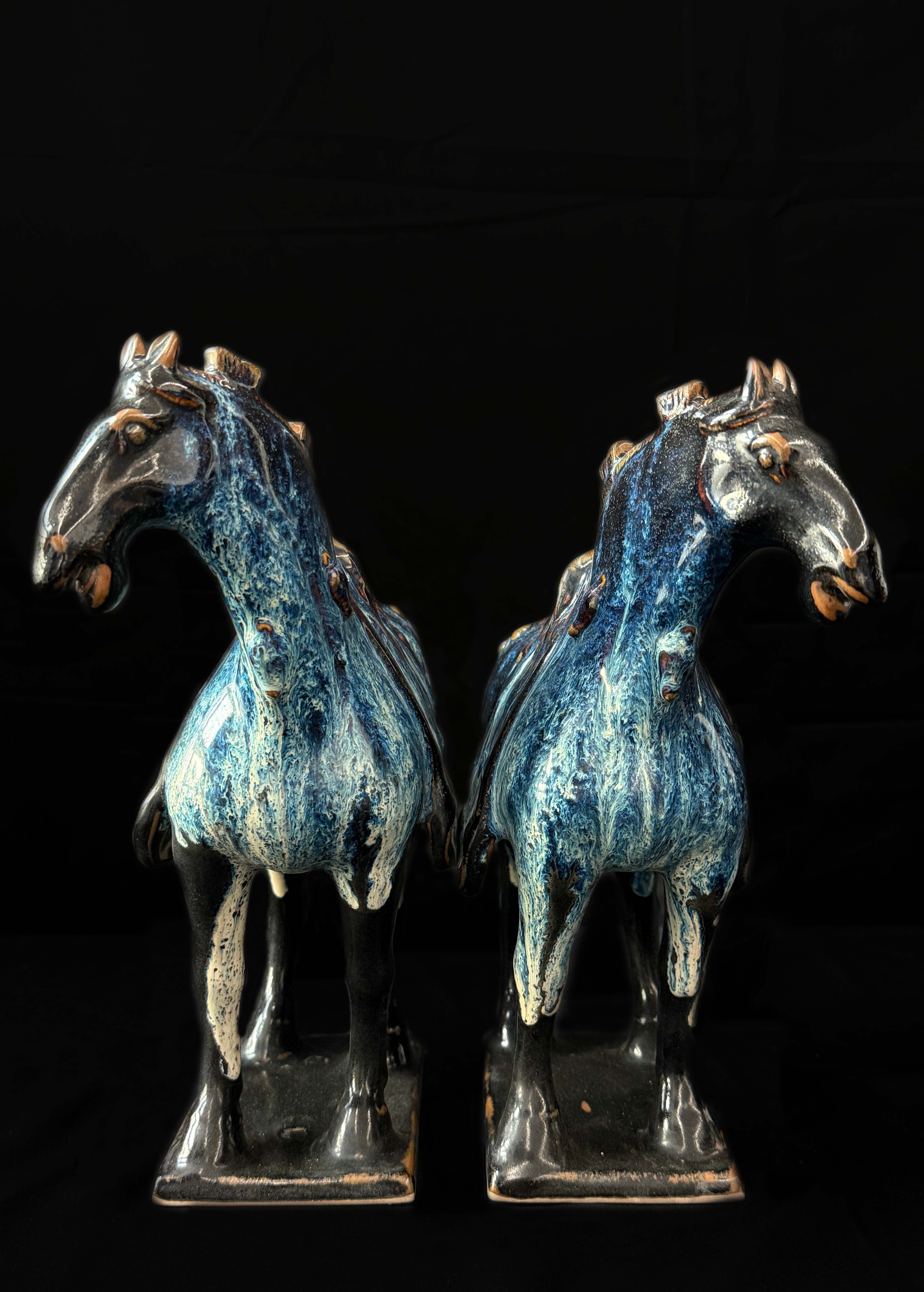 采用断店窑标志性的蓝釉窑变工艺,以黑釉为底,通过金属氧化物在高温中形成蓝白交织的流纹,模拟斑马皮毛纹理,釉面呈现出流动的斑驳质感。