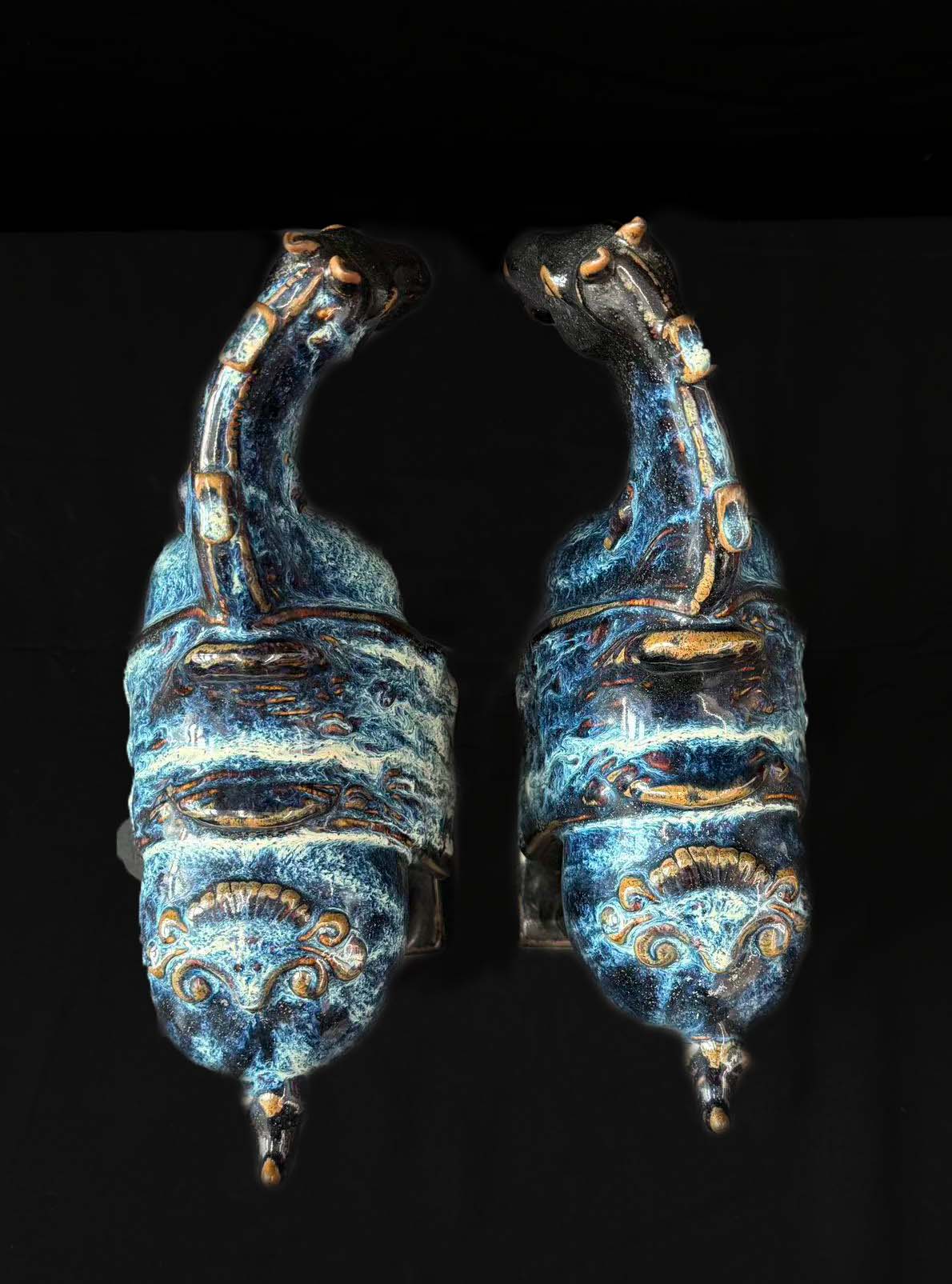 釉色层次丰富,从深邃的藏蓝到浅润的天青自然过渡,局部保留黑釉底色,与蓝白釉形成强烈对比,增强了造型的立体感与视觉冲击力。