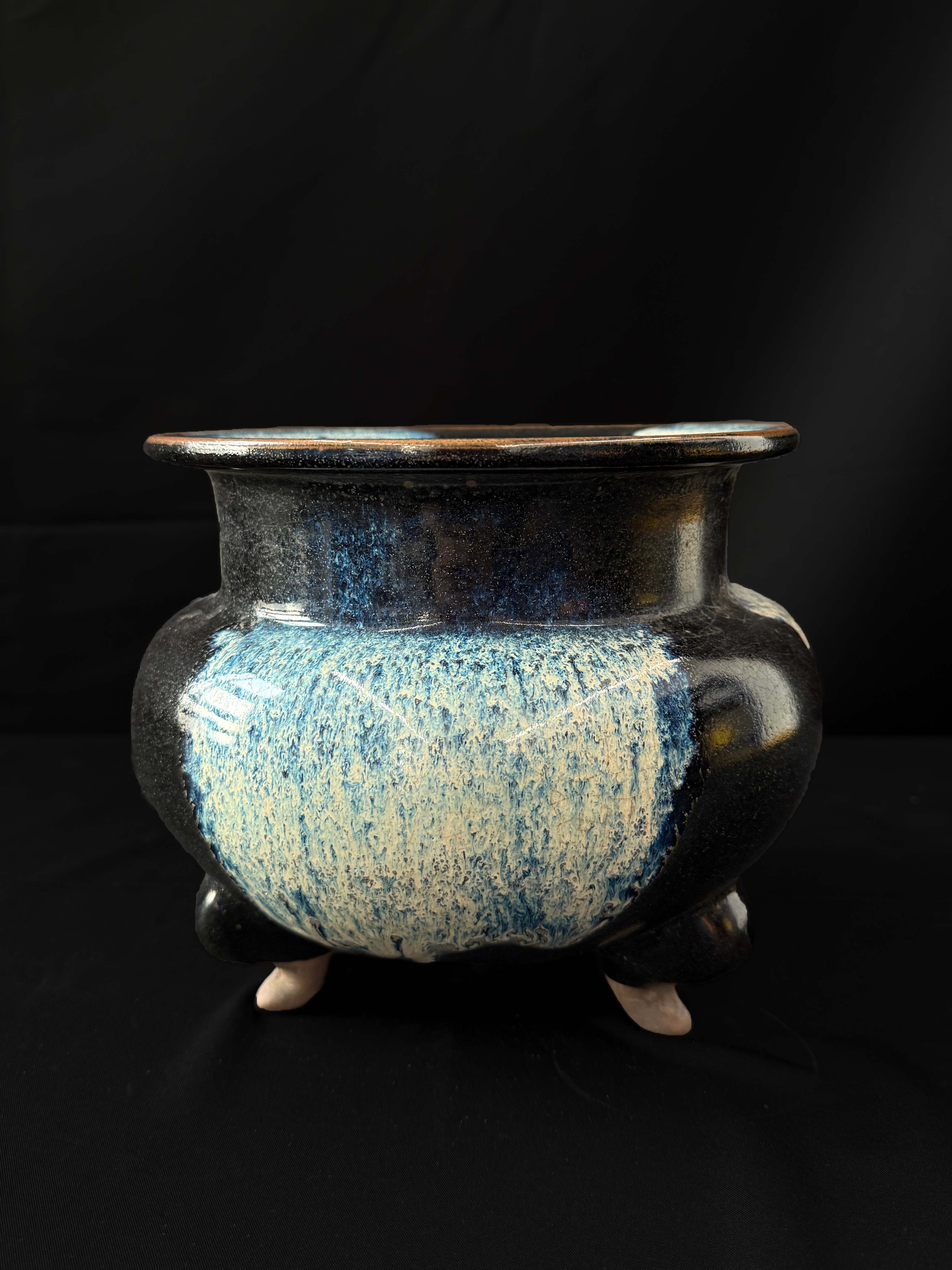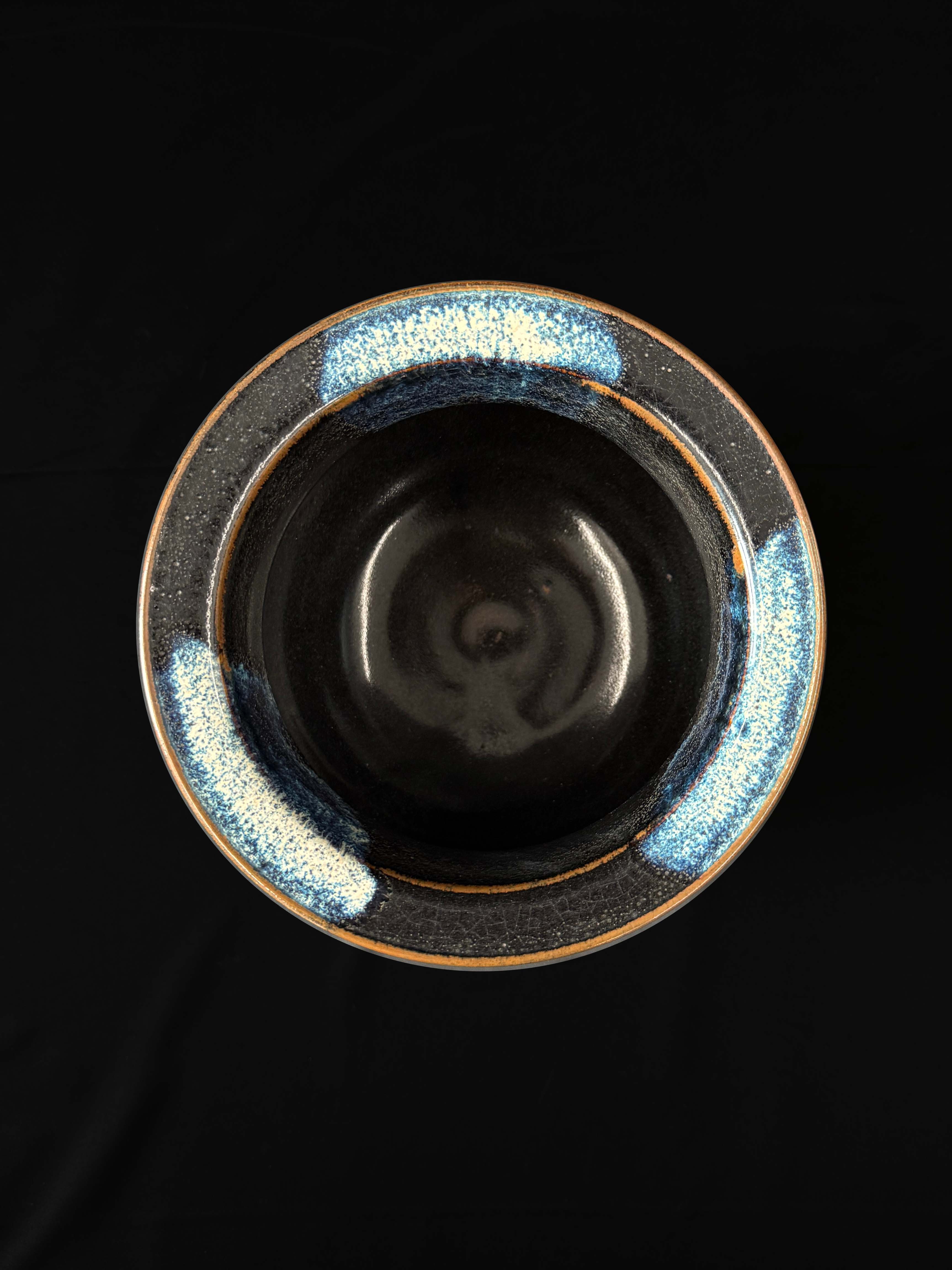 胎质坚实厚重,釉层饱满,采用断店窑标志性的蓝釉窑变工艺,以黑釉为底,通过金属氧化物在高温烧制中自然形成蓝白交织的流纹,呈现出独特的斑驳肌理。仅供参考 自行甄别