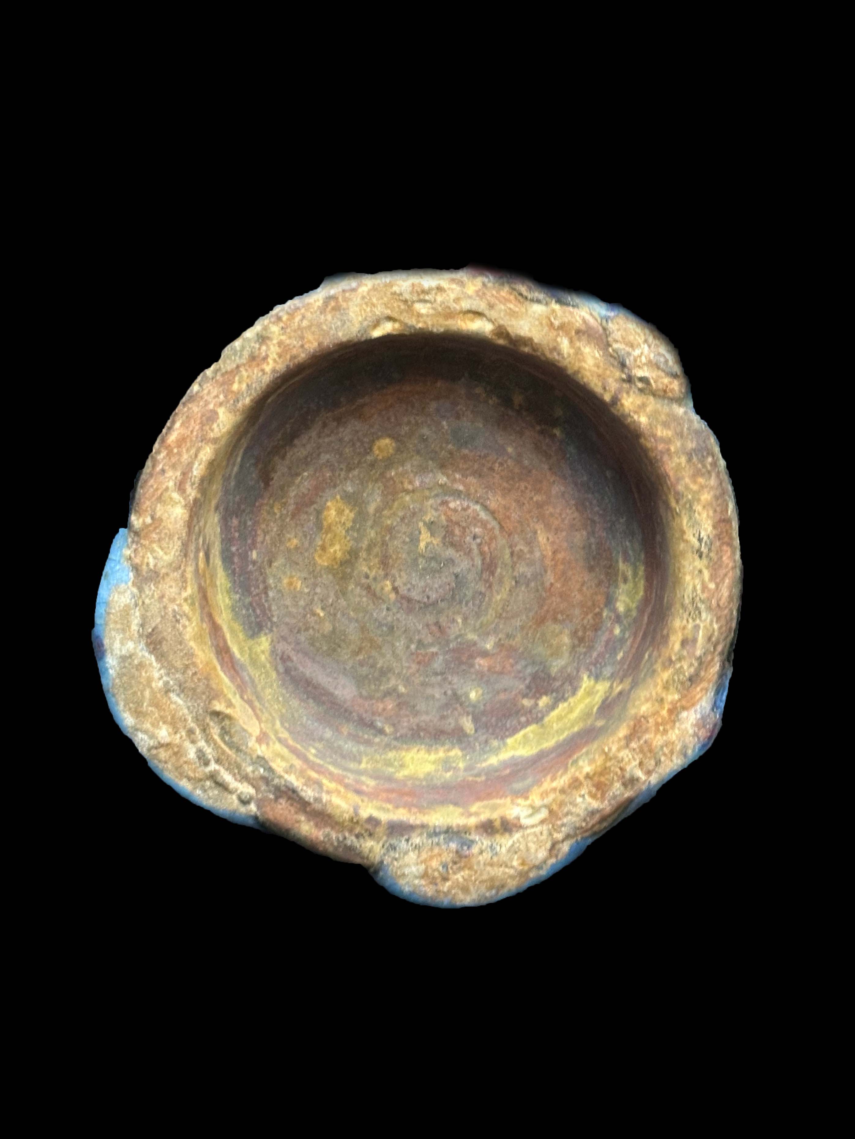 交融流淌,形成不规则的流纹,胎体为浅灰色粗胎,质地坚实厚重。