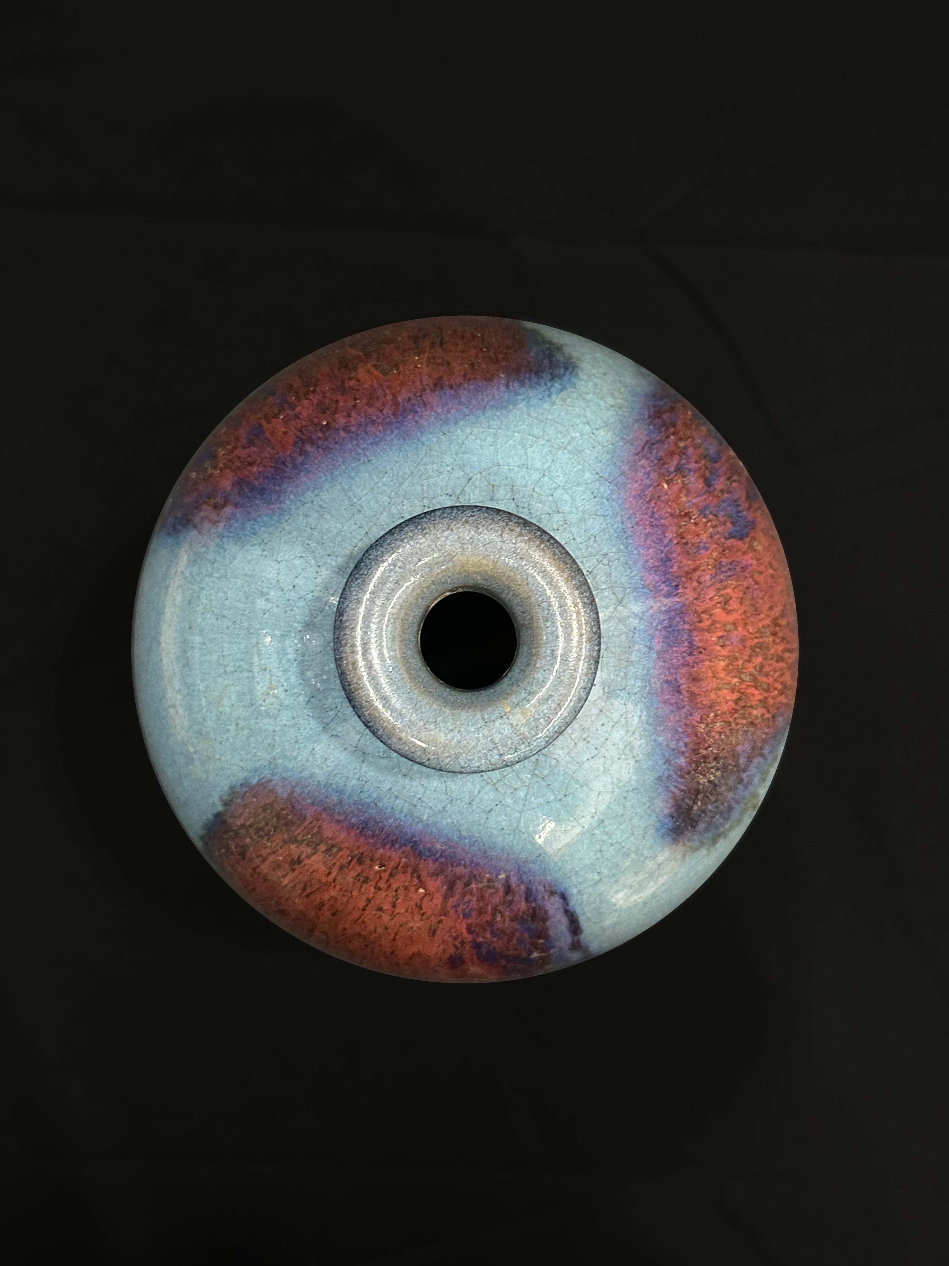 釉面布满细密的冰裂纹开片,瓶身中部晕染出大面积的窑变红斑,色彩从深紫到艳红自然过渡,呈现出 “窑变无双” 的独特效果。