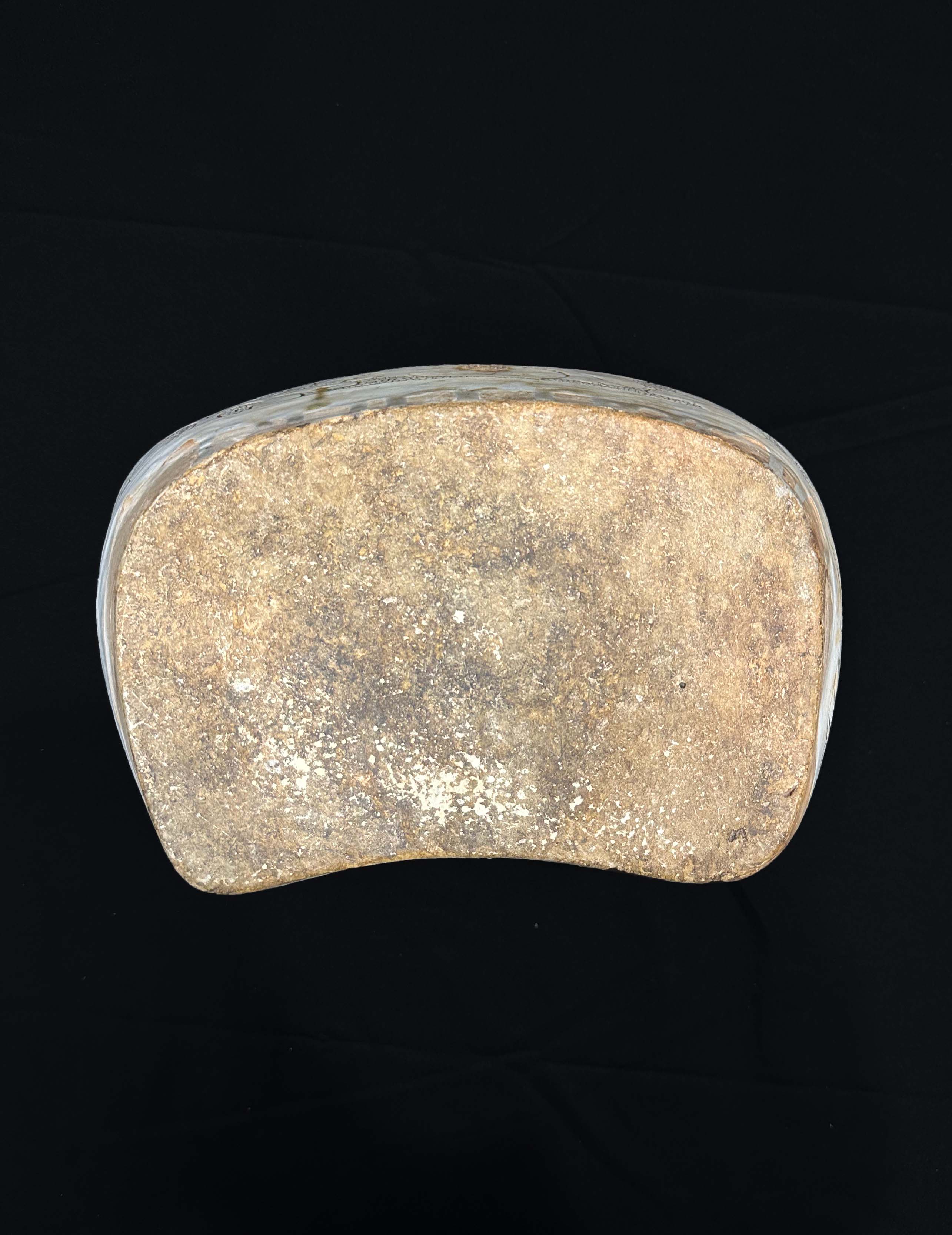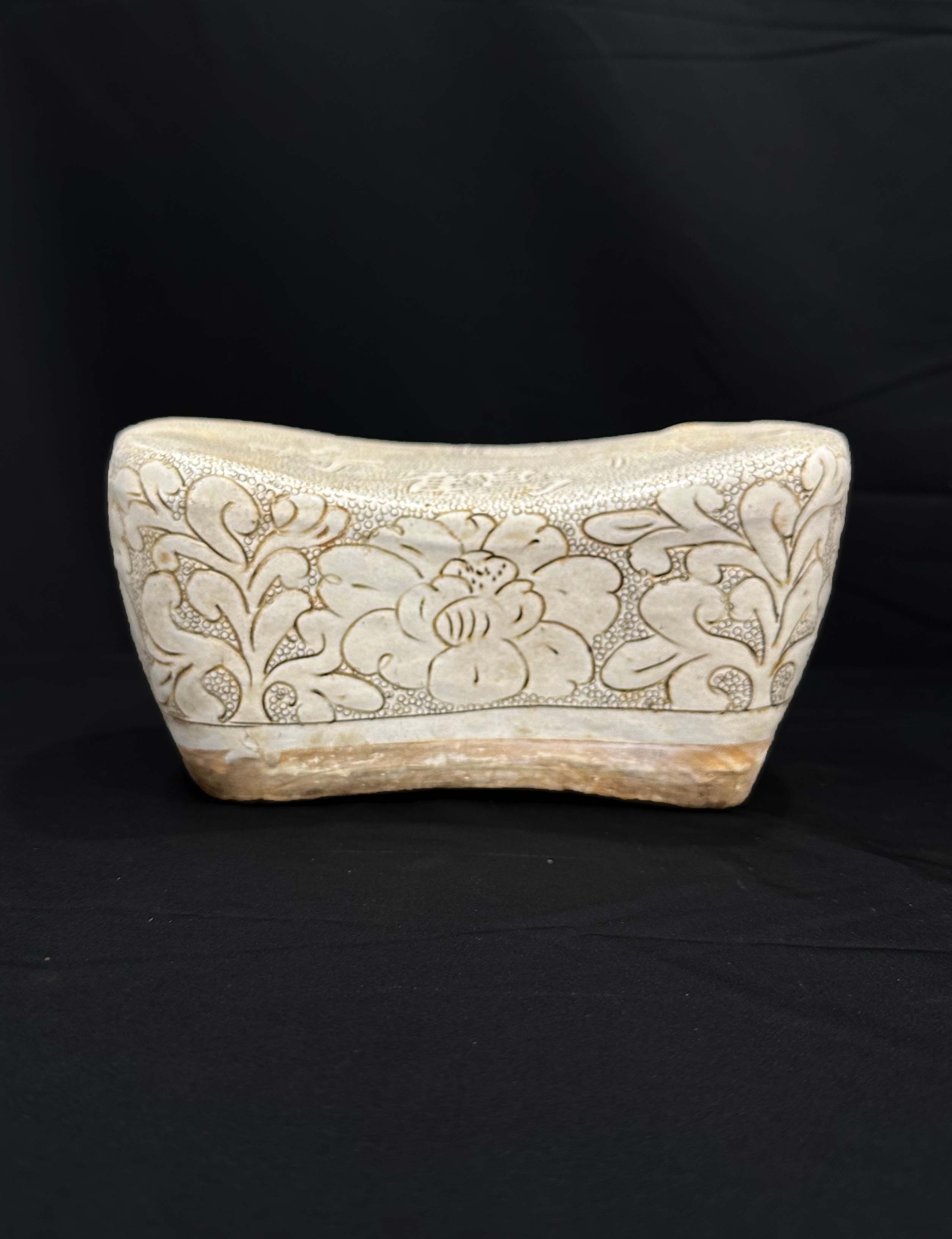 胎体为灰褐色粗胎,施白色化妆土,罩透明釉,釉面温润,局部可见细微开片,器型为元宝形枕,线条圆润饱满,符合人体工学,既可以作为纳凉的寝具,也可作为文房的臂搁或陈设器。仅供参考 自行甄别