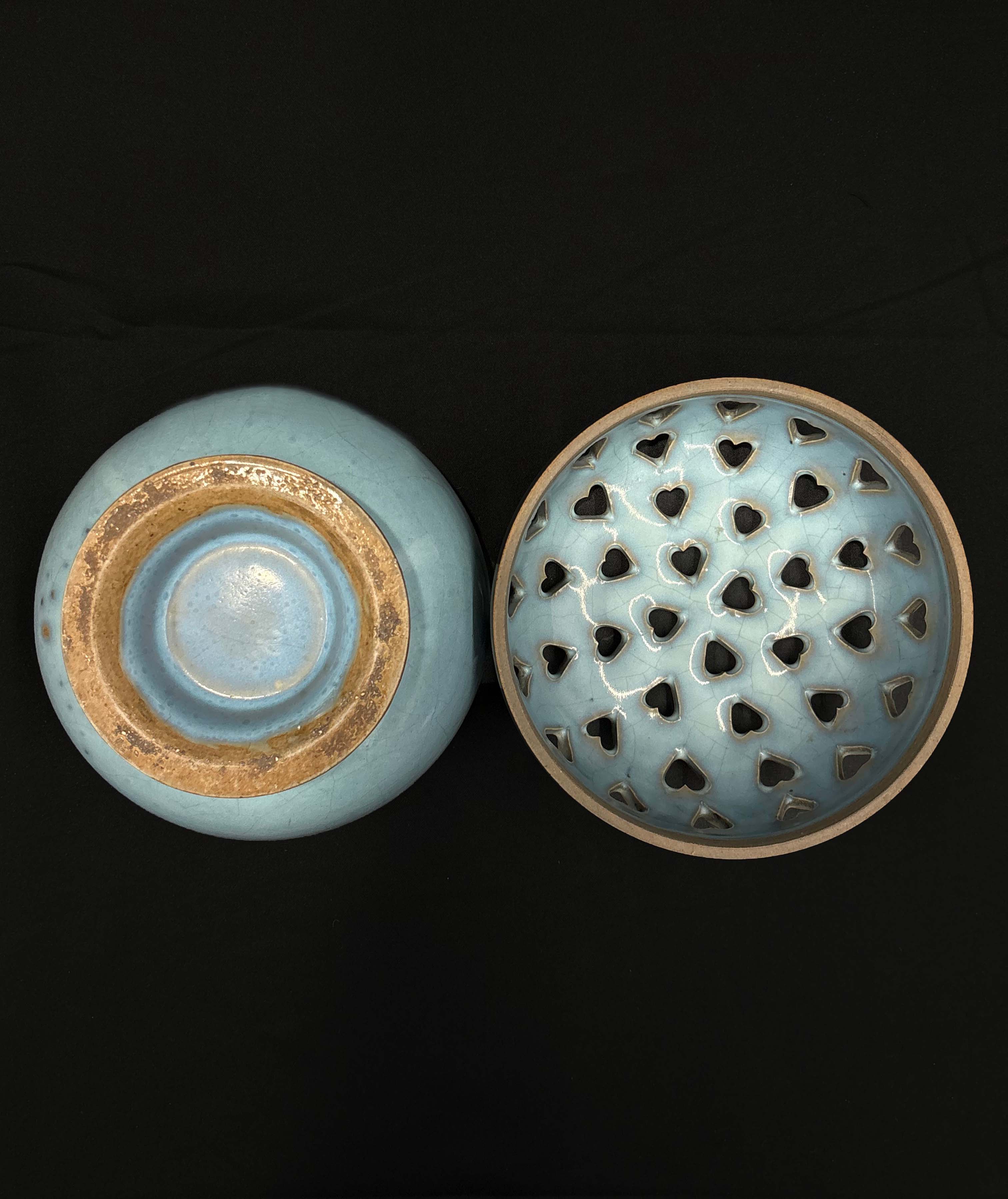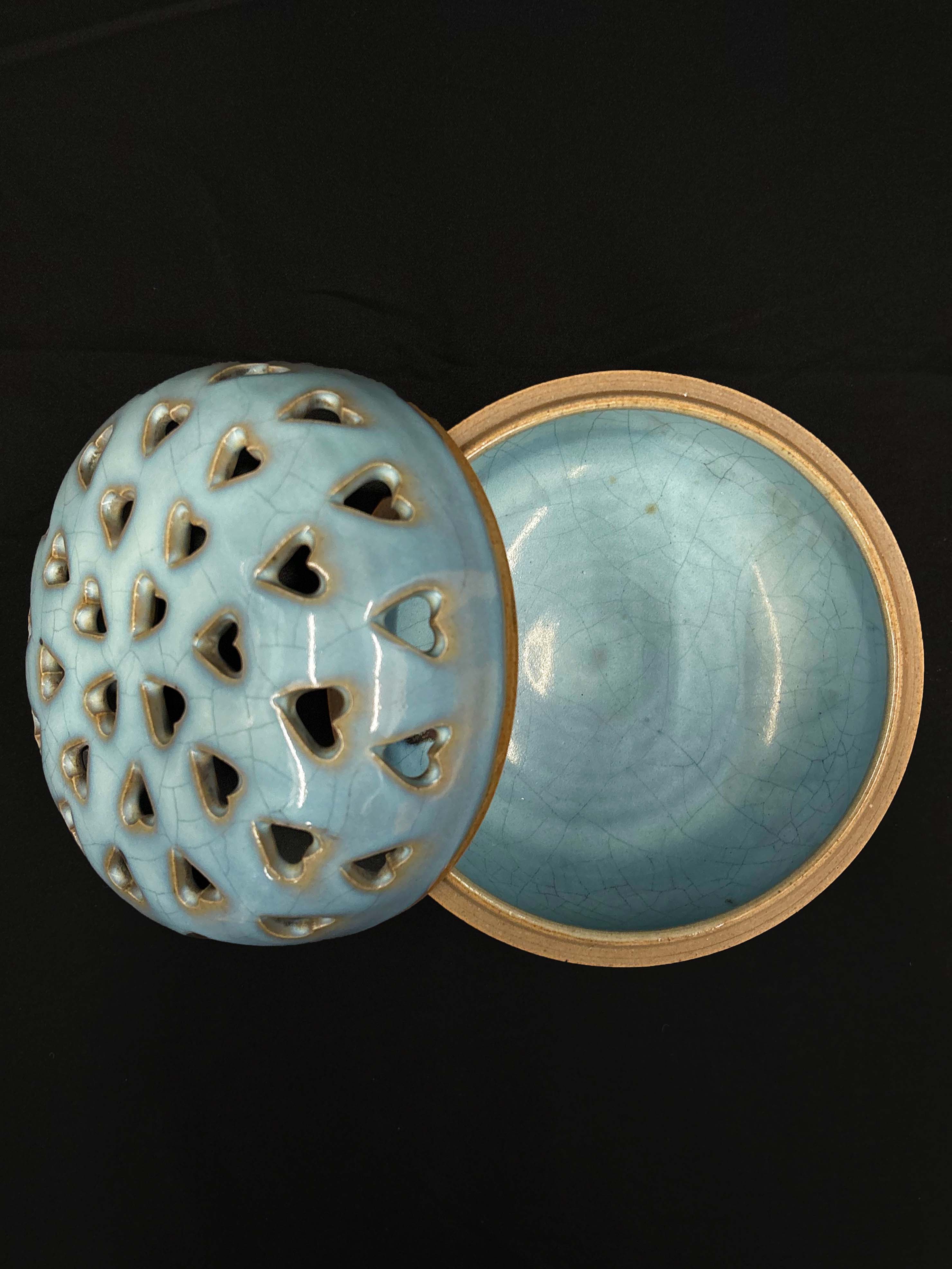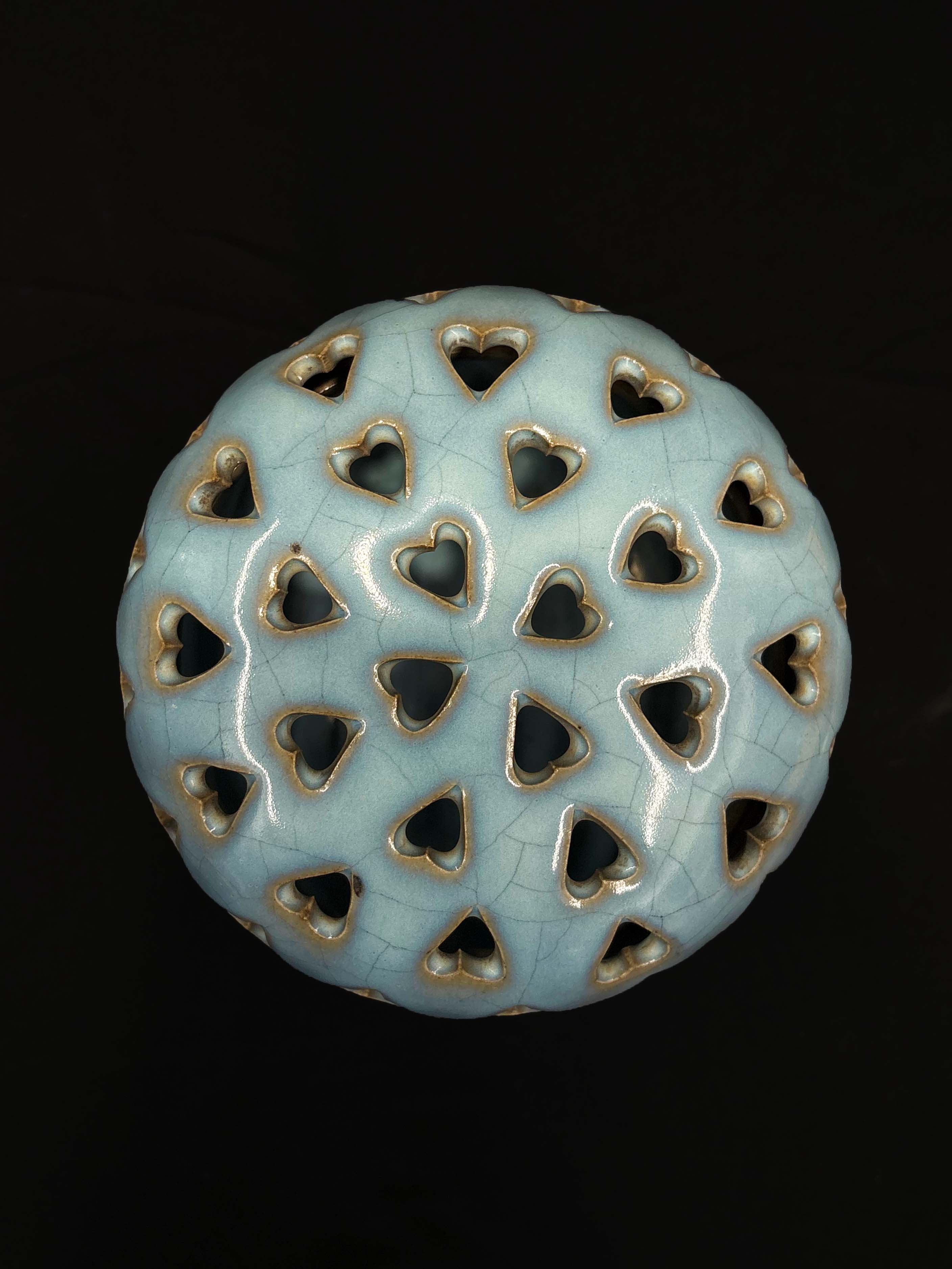 整体为分体式设计,由炉身与镂空炉盖组成。炉盖采用心形与圆形镂空,既便于香气散逸,炉身为浅腹、高圈足造型,线条饱满稳。仅供参考 自行甄别