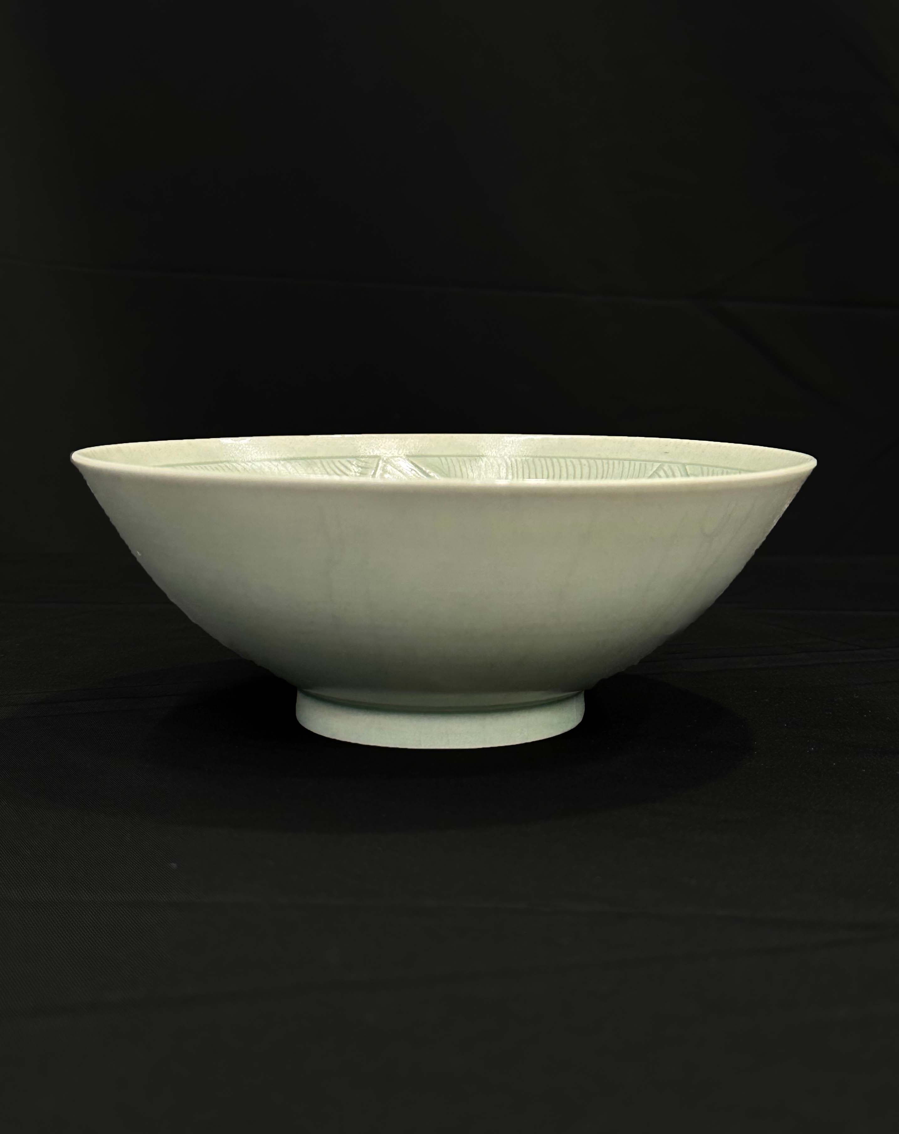 器型为敞口、弧壁、圈足的大碗造型,线条流畅饱满,采用刻花工艺,碗心刻有翻腾的龙纹,周围衬以水波纹,线条流畅有力,具有鲜明的浮雕立体感。