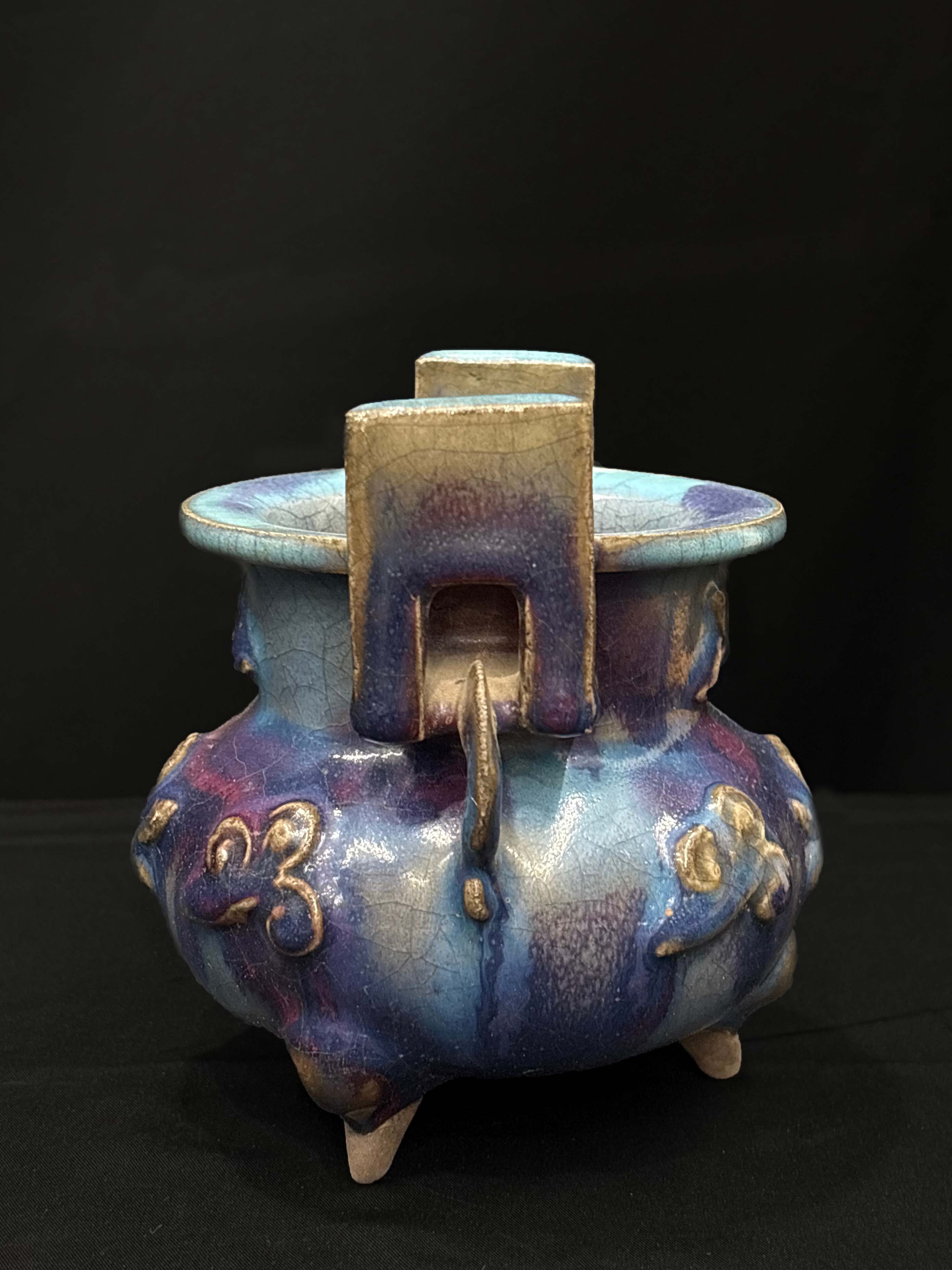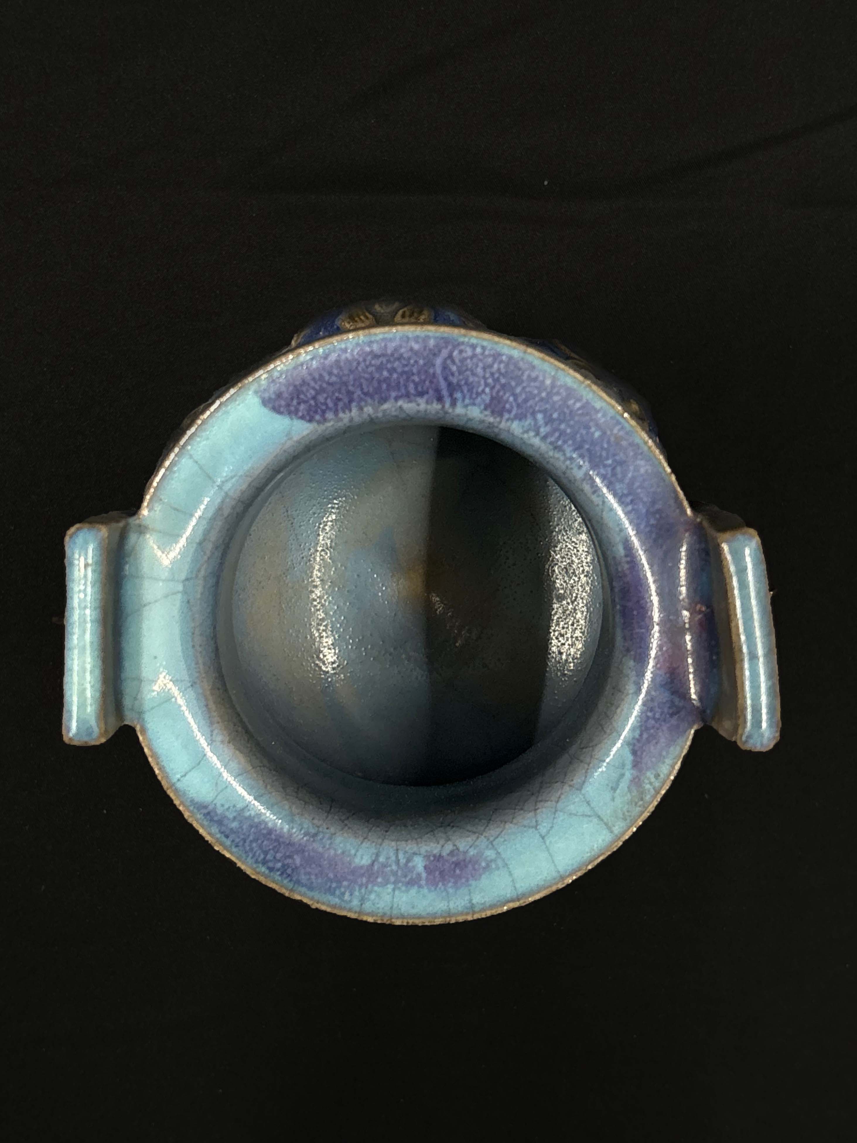 釉面以天蓝色为底,交织着紫红斑块,整体为敞口、鼓腹、三足造型,口沿两侧设直立的方耳,腹部装饰贴塑花卉纹样。线条饱满稳重。
