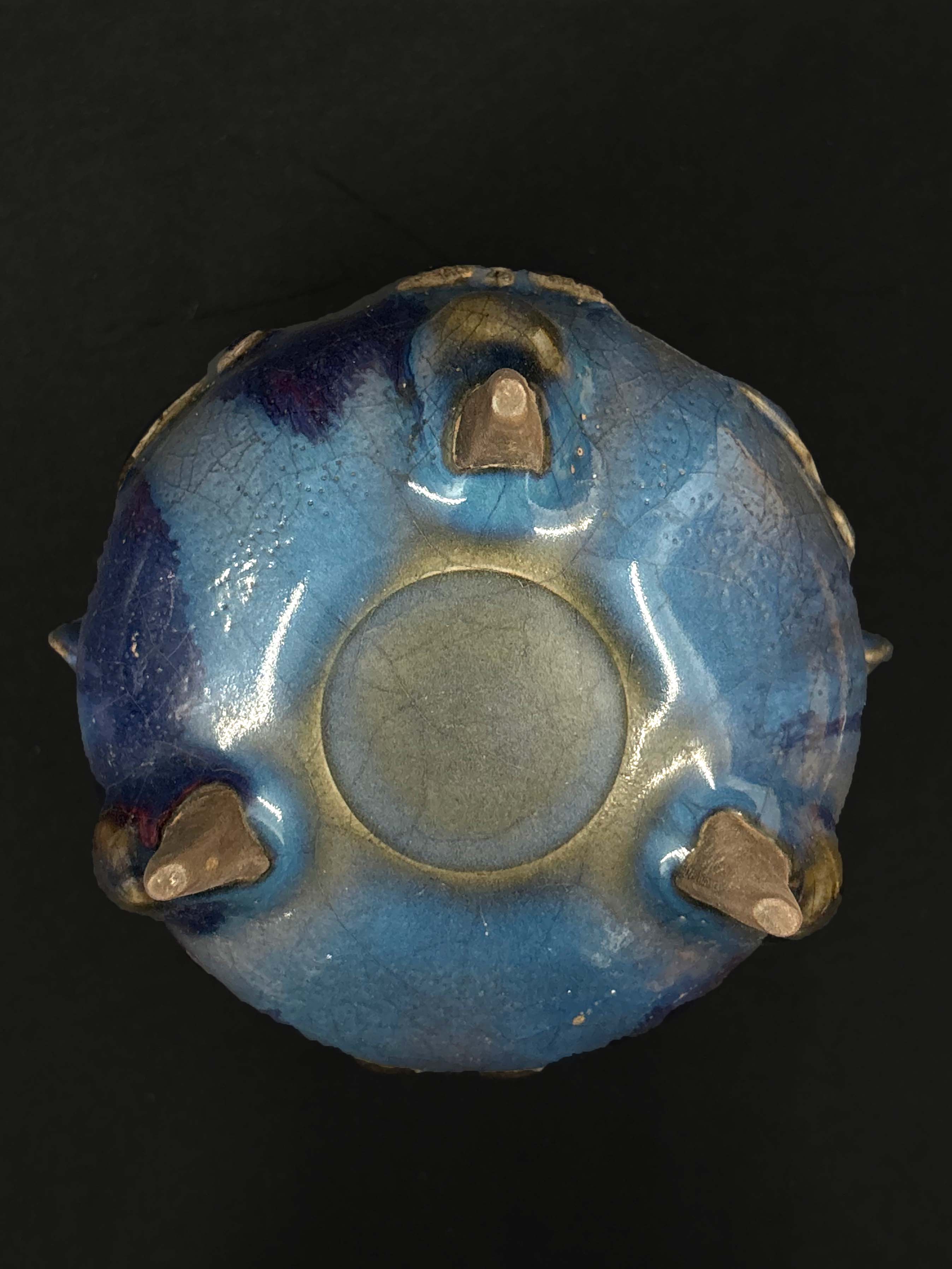釉面布满细碎的冰裂纹开片,这是钧窑釉面因胎釉膨胀系数差异形成的自然纹理,增加了器物的古朴质感。仅供参考 自行甄别