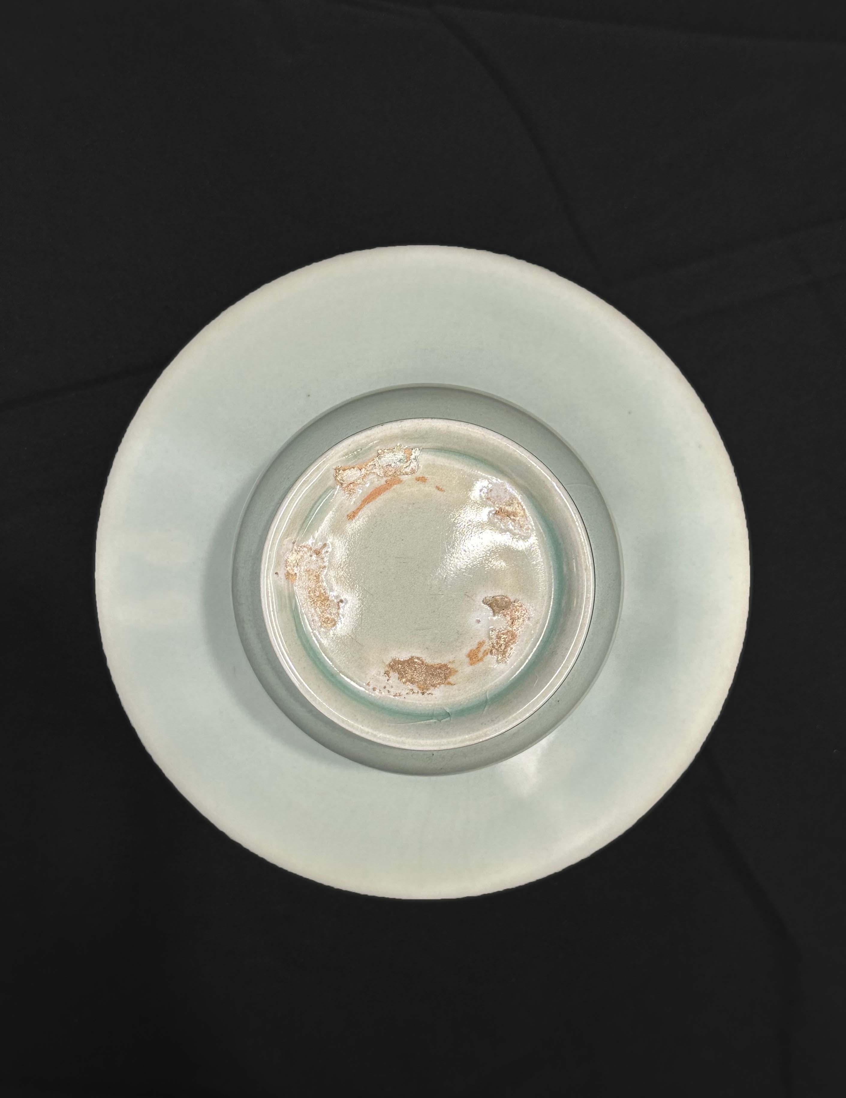 盘沿采用越窑标志性的细线刻花技法,刻有双凤穿云纹样,凤鸟姿态舒展,云纹飘逸灵动,中心区域辅以同心圆水波纹,刻纹细腻清晰。