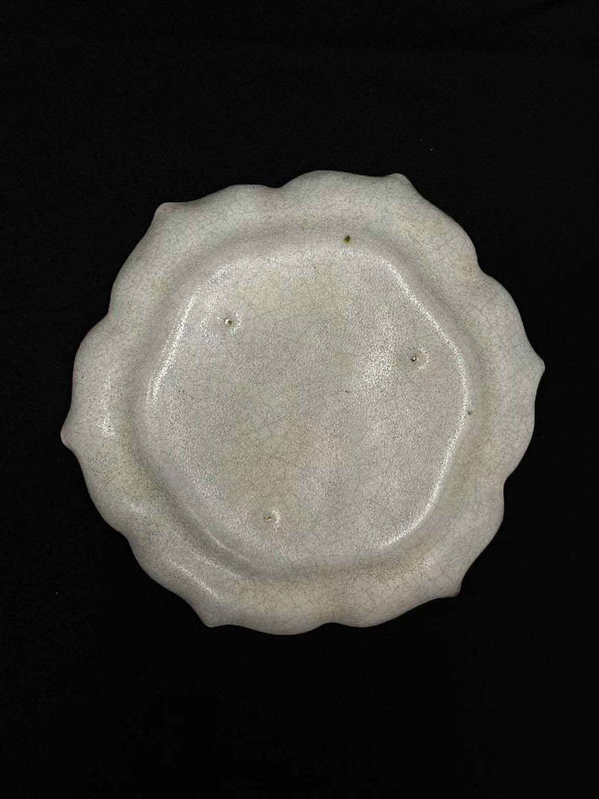 釉面呈现汝窑标志性的月白色调,温润莹润,整体为葵口造型,口沿呈花瓣状弧曲,中心为浅凹区域,模仿了葵花的自然形态。
