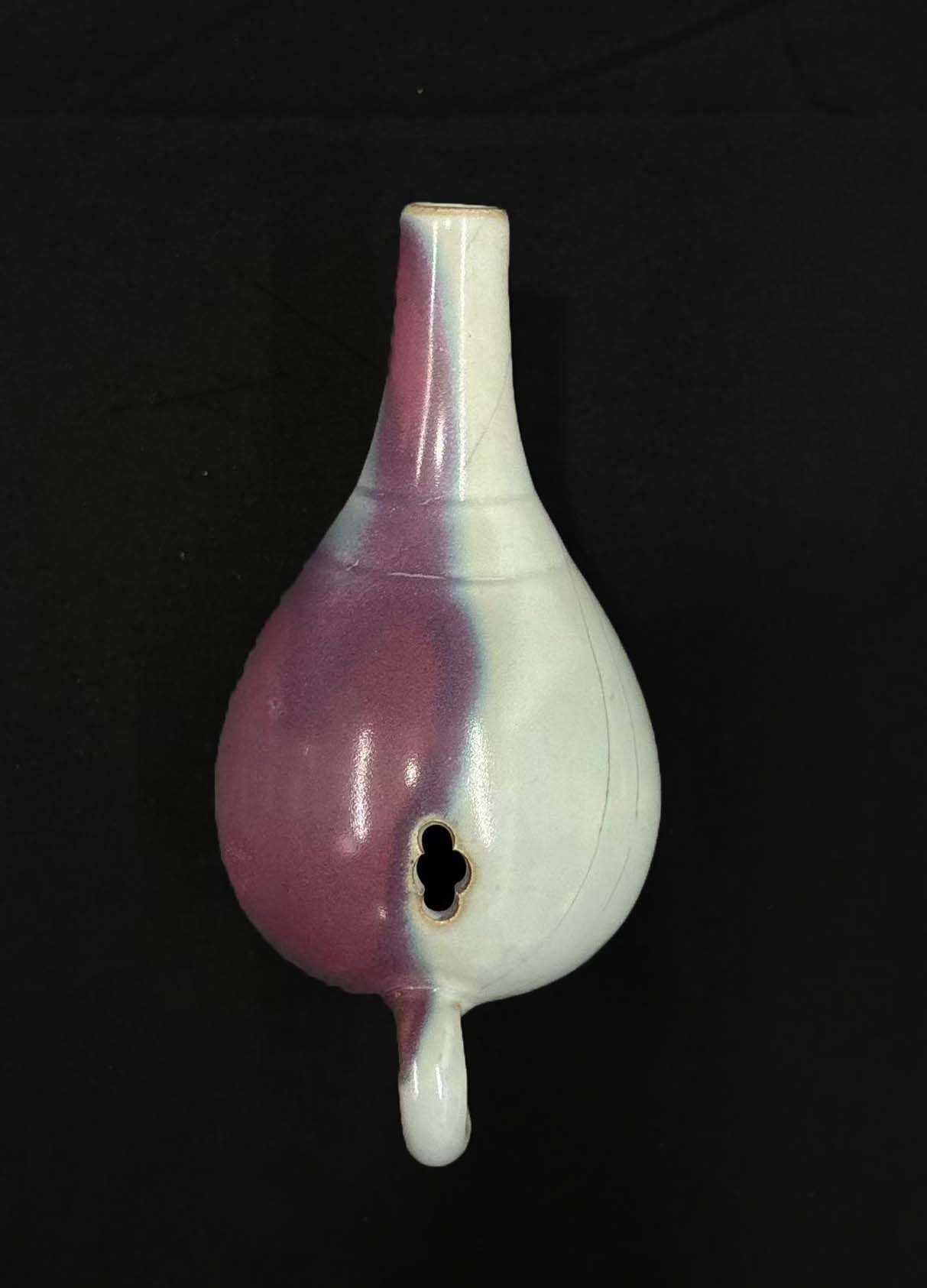 壶身与壶嘴覆盖着浓郁的玫瑰紫色窑变斑块,色彩过渡自然,以钧窑标志性的天青釉为底釉,釉质温润莹润。