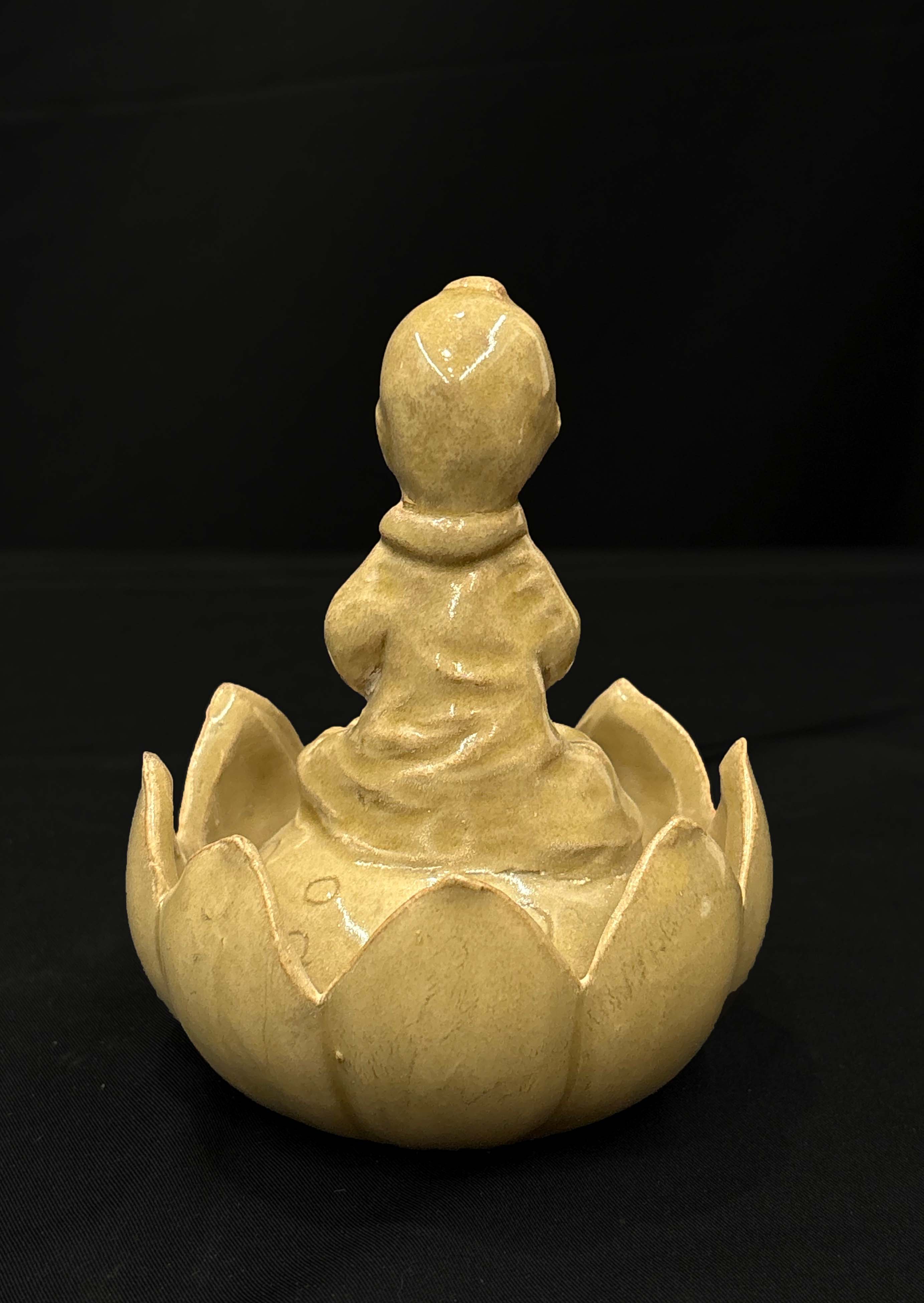 釉层均匀饱满,莲瓣与童子衣纹处因釉层较薄露出浅褐色胎色,由底部的仰莲台与上部的童子造像组成。莲台为双层仰莲造型,花瓣饱满圆润;童子呈结跏趺坐姿态,双手合十,面容圆润含笑,头顶有独特的发髻造型。