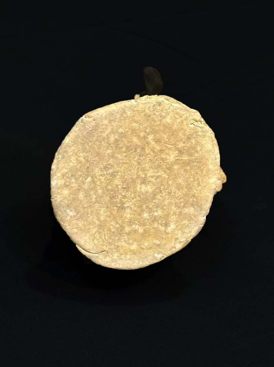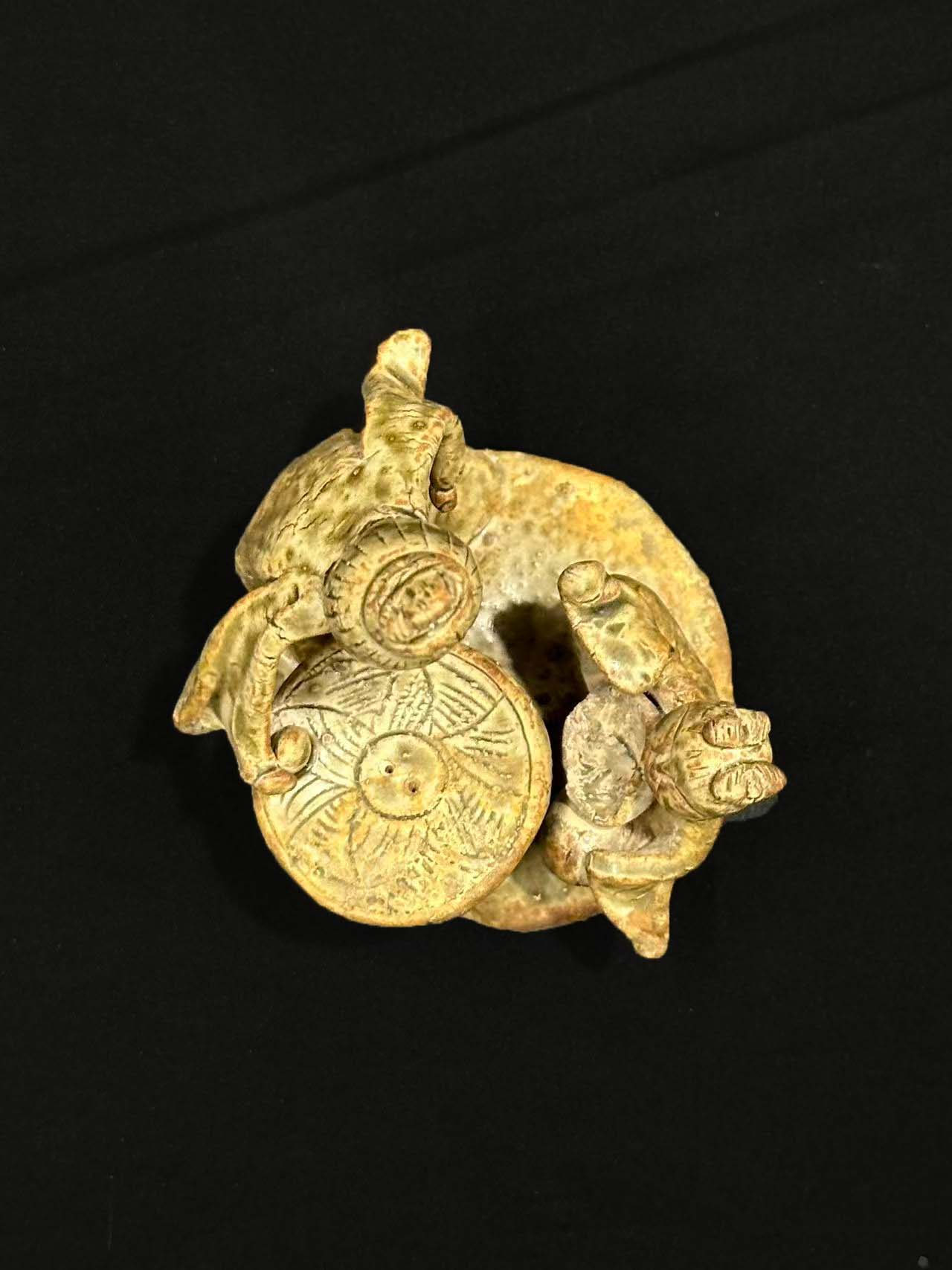 呈现青黄釉色,釉质温润莹润,表面带有细微的开片纹理与土沁痕迹,胎体呈浅灰褐色,质地坚实,层较薄且分布不均,人物衣纹与器物底座处因釉层较薄露出胎色