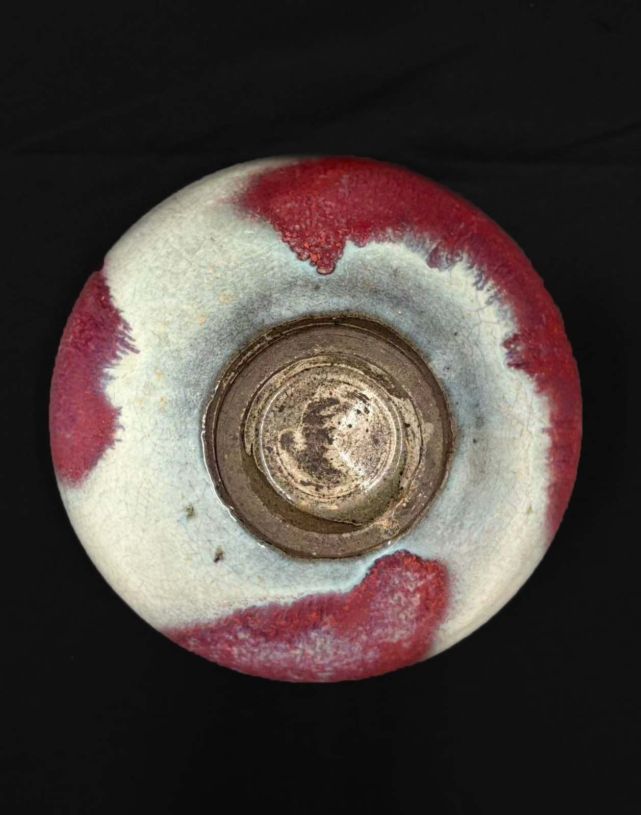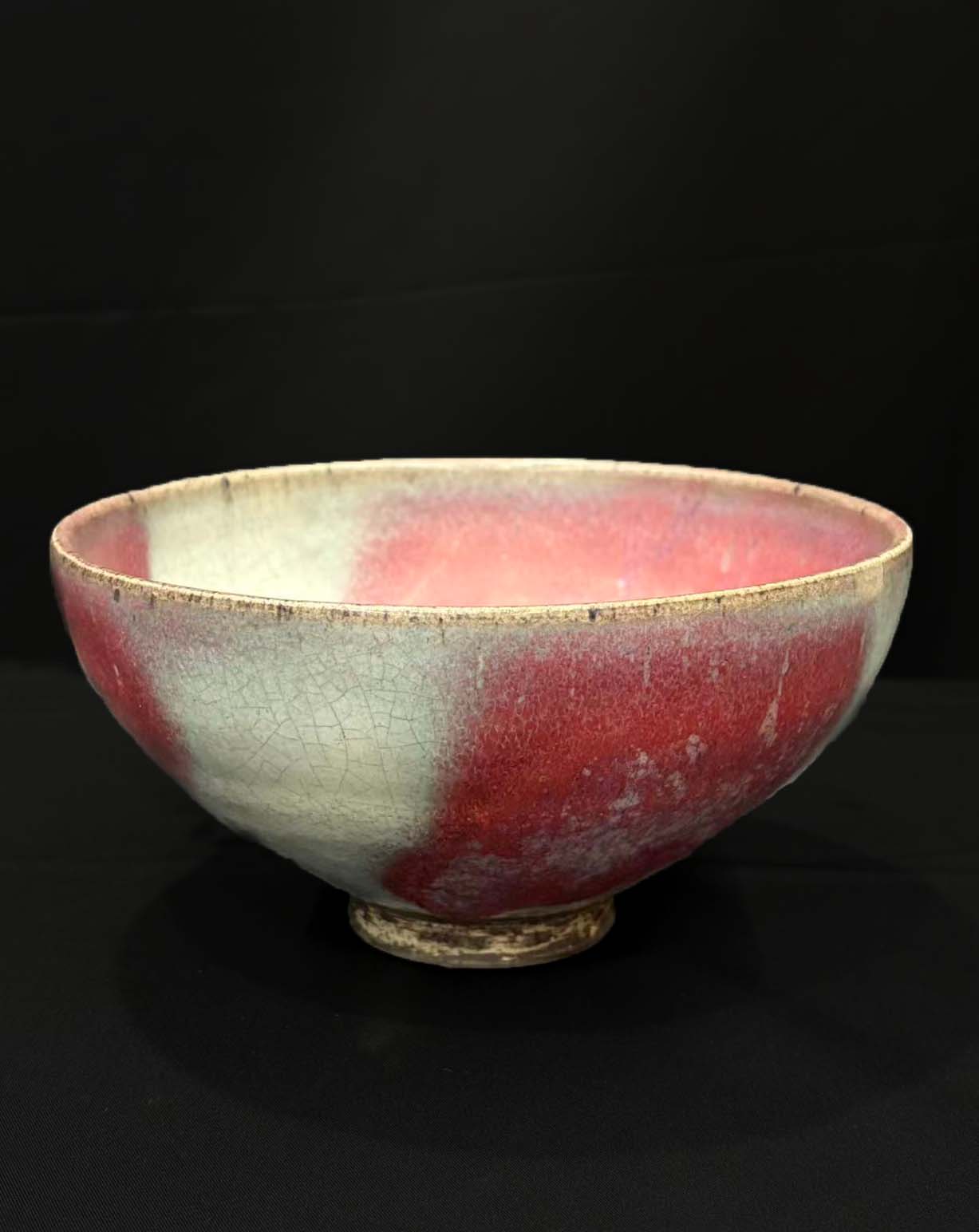 以浓郁的玫瑰红釉为主体,釉质温润莹润,碗心自然形成一条蜿蜒的月白色窑变带,如流云般贯穿碗面,色彩对比鲜明且过渡自然。