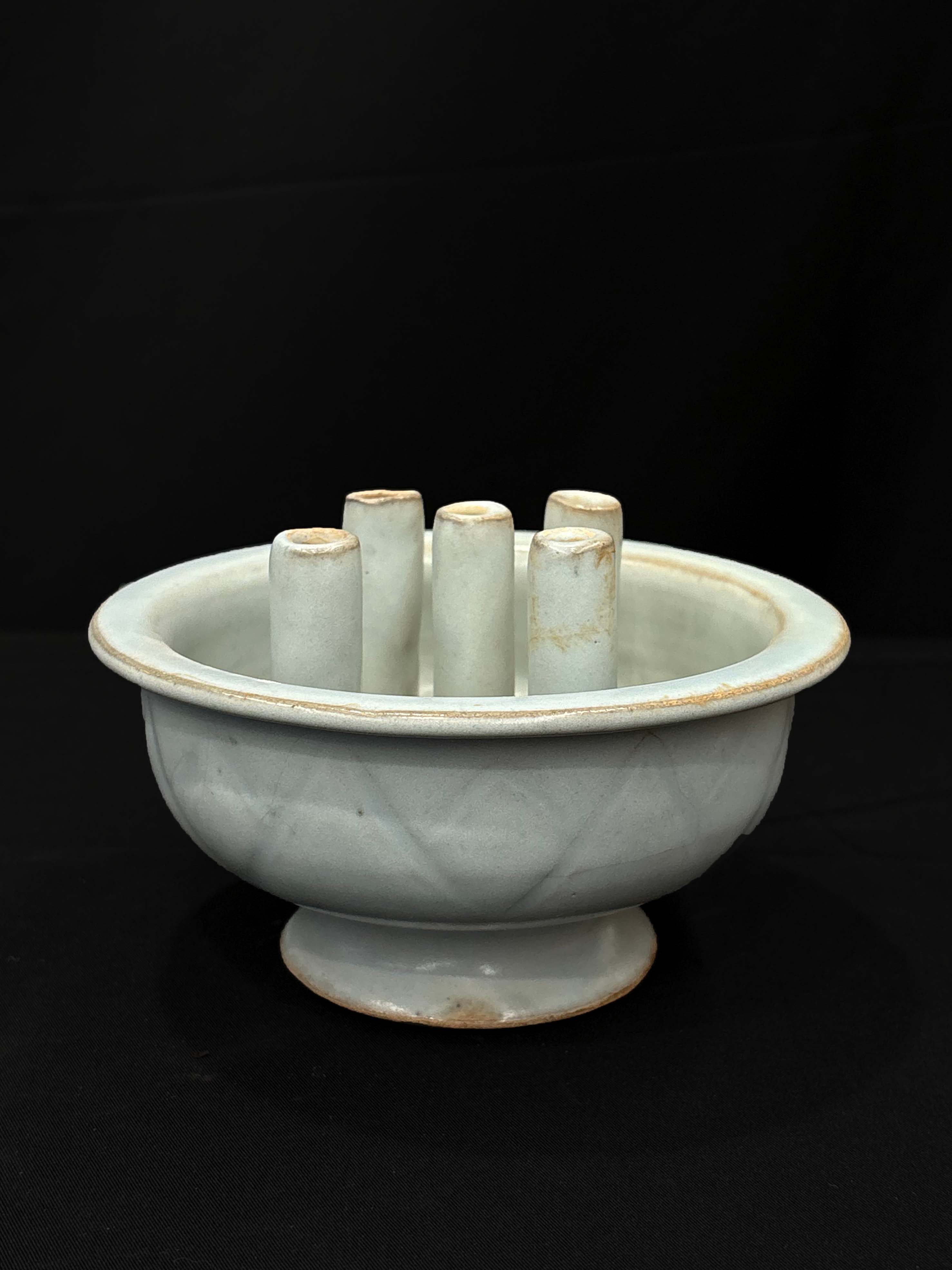 整体为敞口、弧腹、高圈足的洗式造型,中心竖立五根圆形插管。洗的器型规整饱满,插管高低错落。