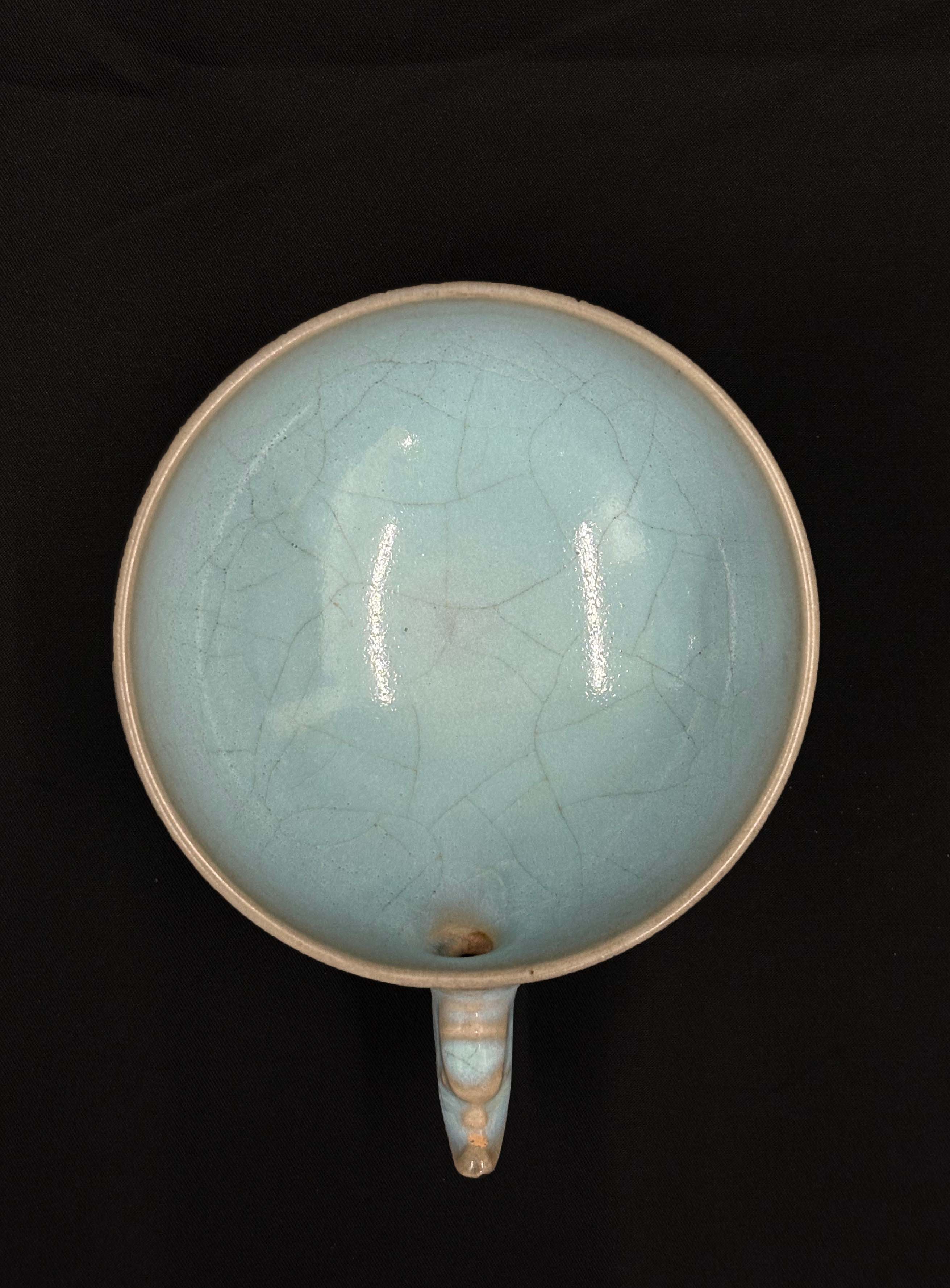 釉色为汝窑经典的天青色,釉面温润莹润,釉面布满细碎的冰裂纹开片。仅供参考 自行甄别