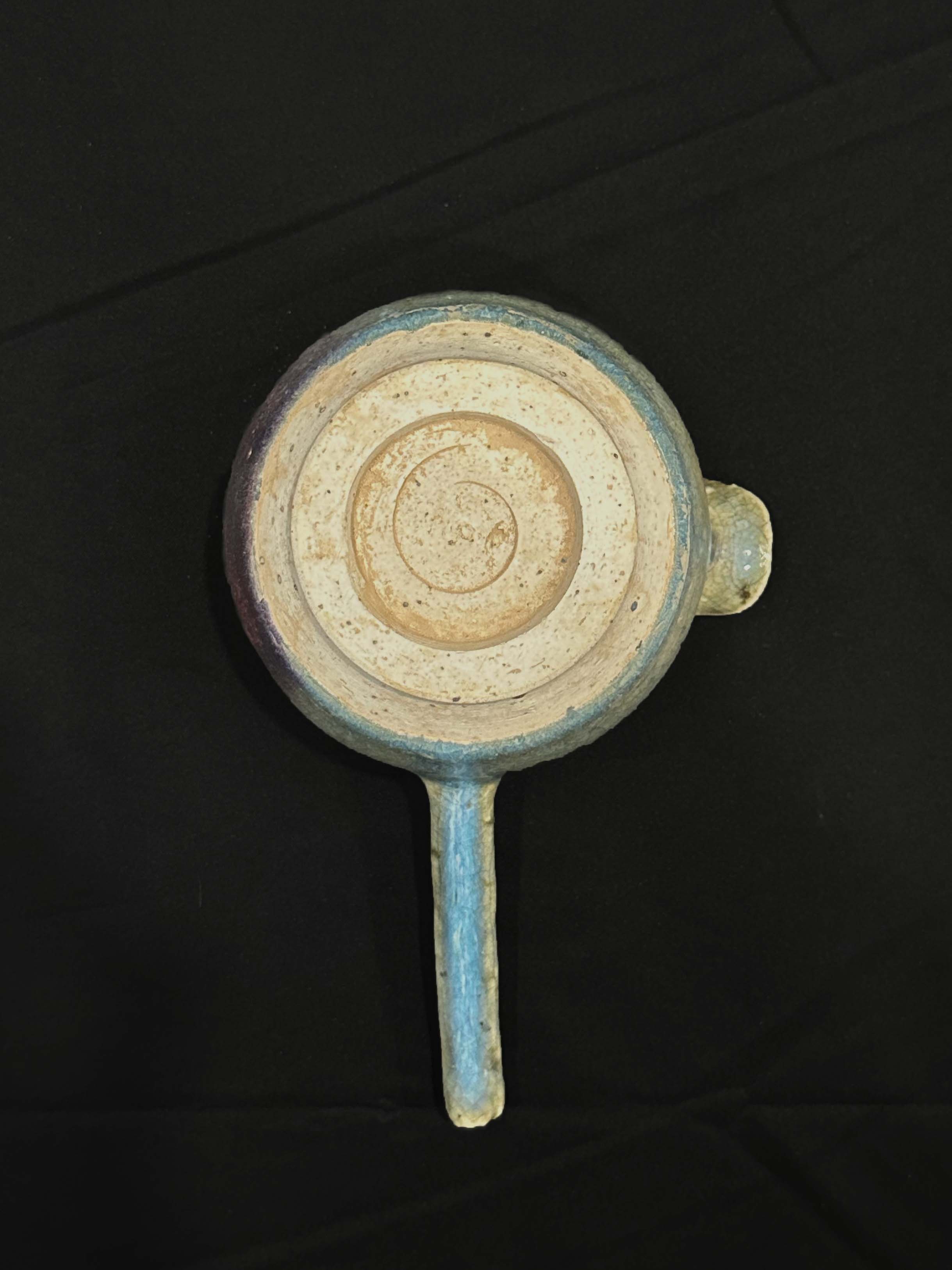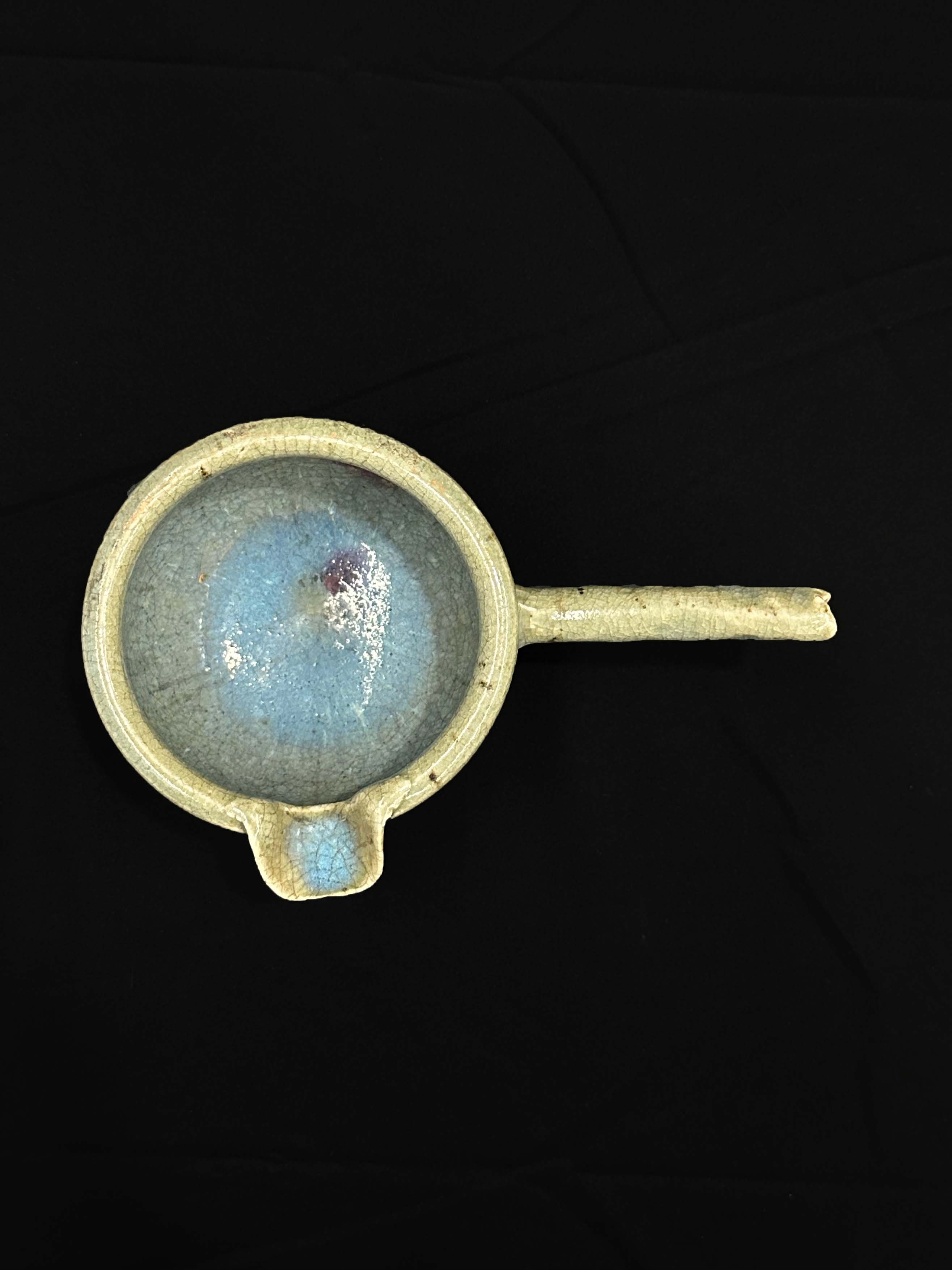 器身为敞口、弧腹、矮圈足的碗形,口沿外侧有一道凸起的弦纹,口沿一侧设宽流便于倾倒,另一侧接长柄便于握持。