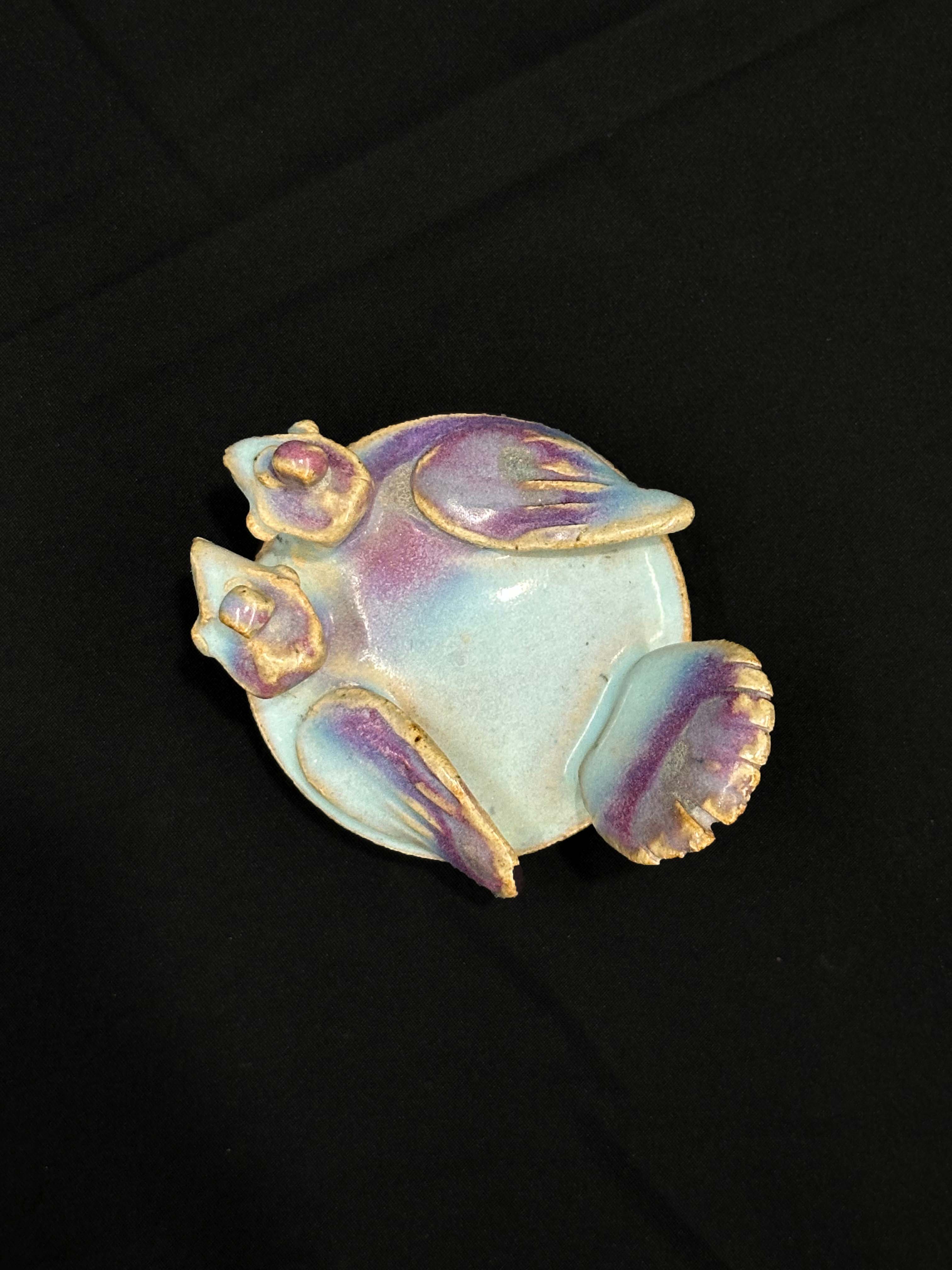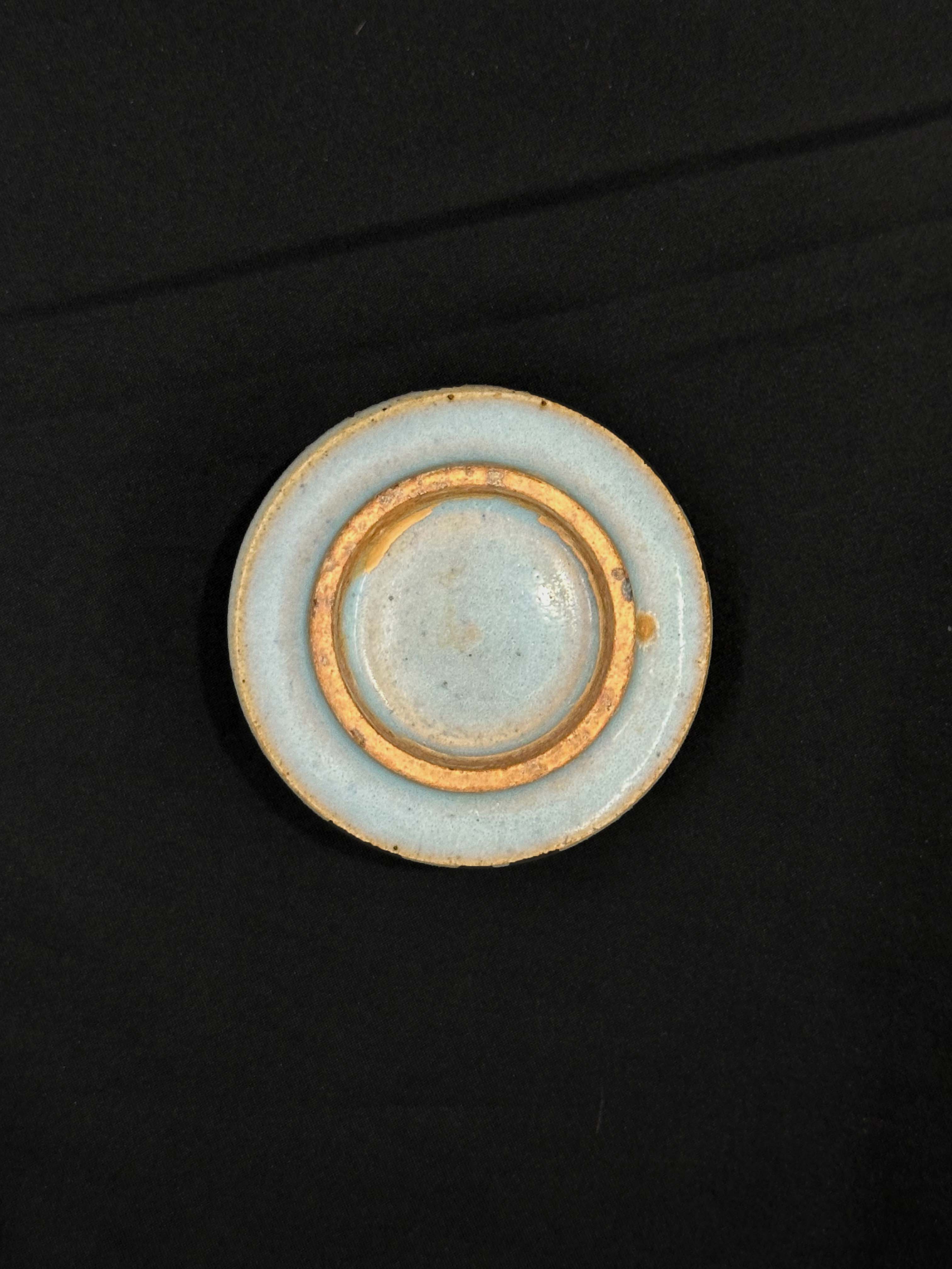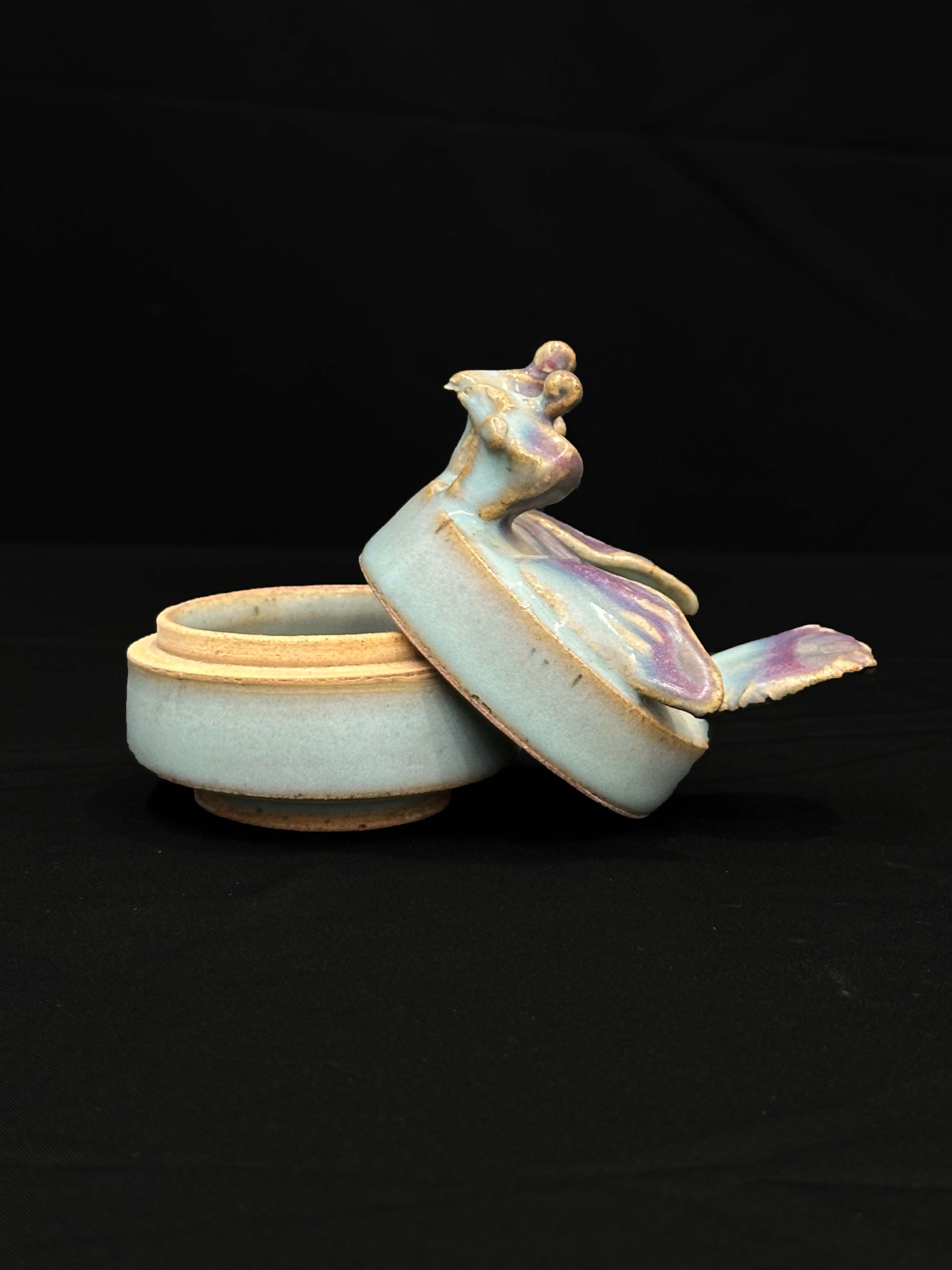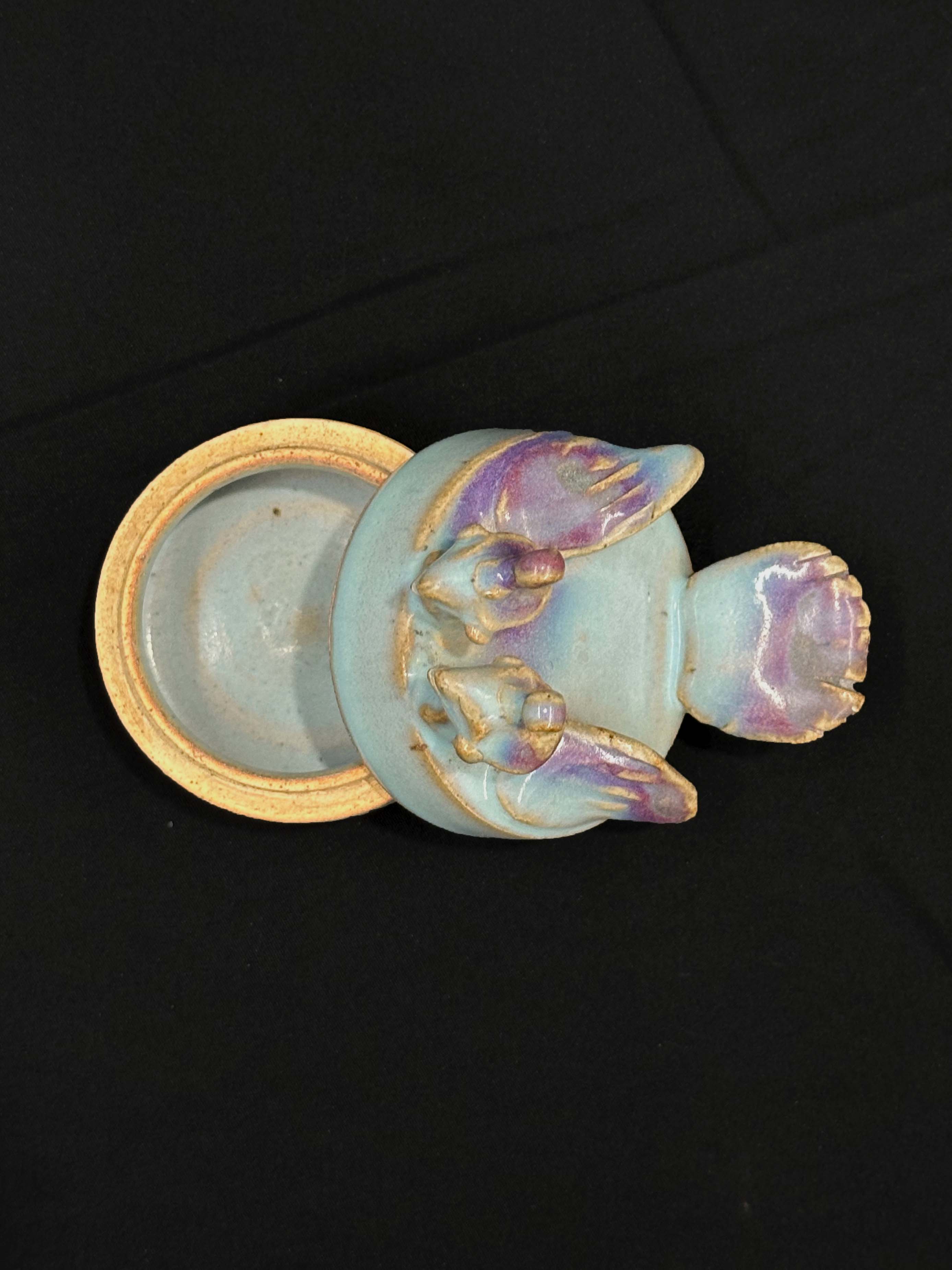 主体釉色为钧窑标志性的天蓝色,盖顶花鸟装饰上的玫瑰紫色斑,是钧窑窑变效果的体现。仅供参考 自行甄别