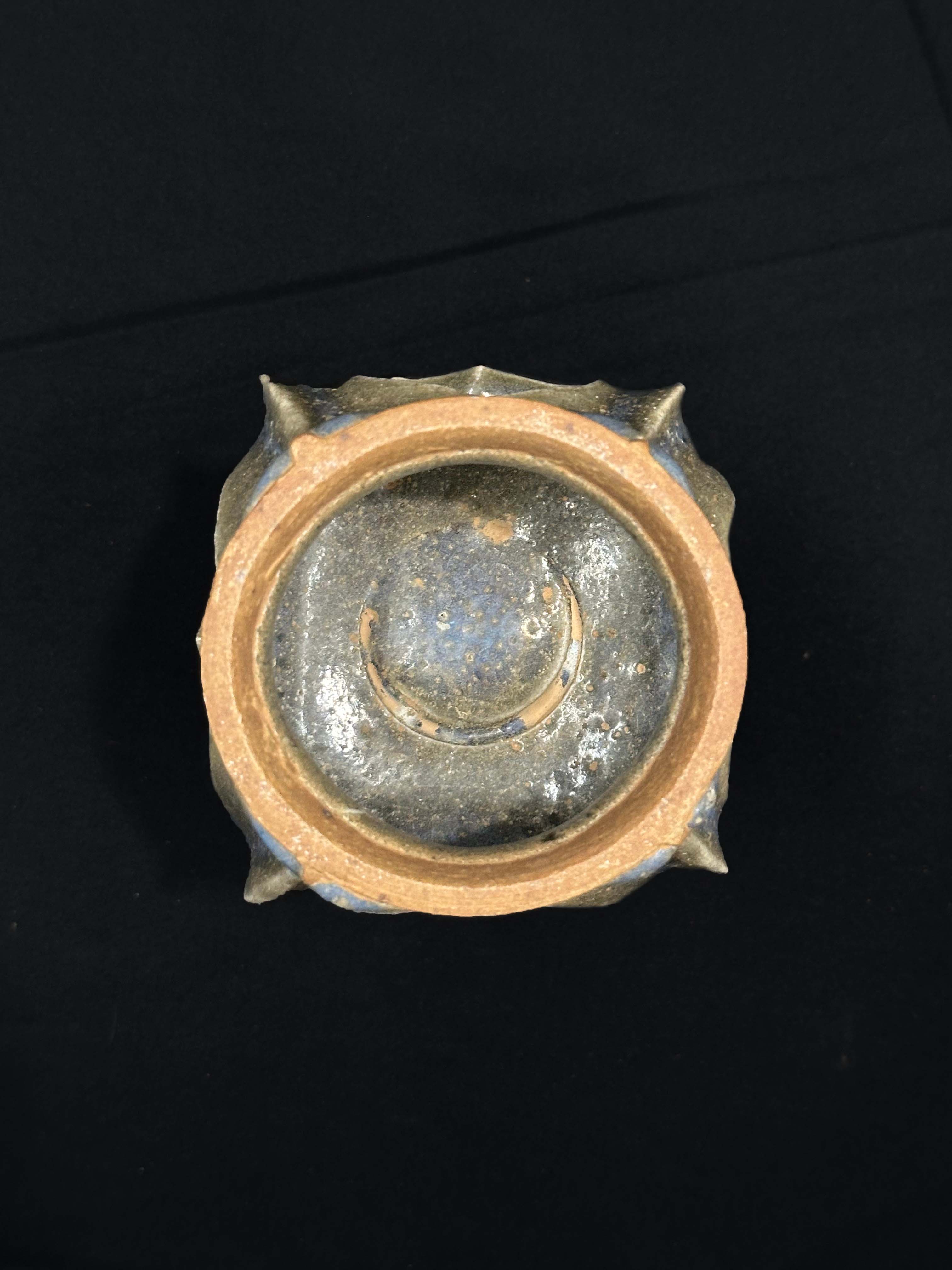 底座设计为花瓣状轮廓,四面镂空出心形孔洞,既减轻了器物重量,通体施钧窑风格的天蓝釉,釉面呈现自然的乳浊质感,局部因窑变呈现深浅不一的蓝灰过渡。