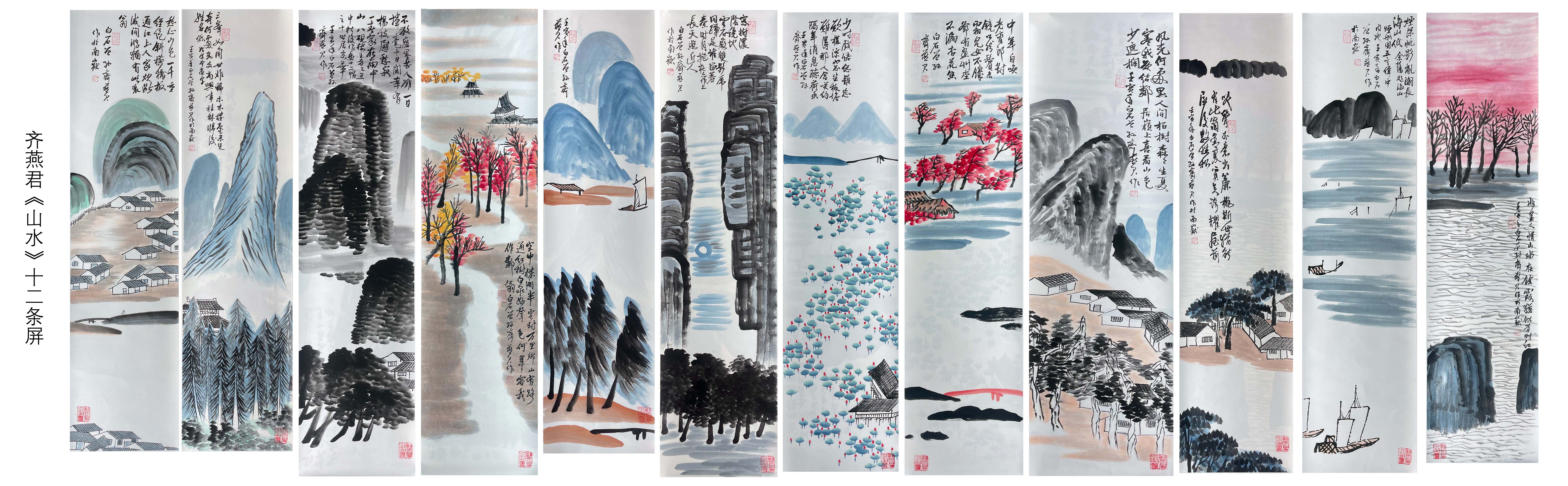1.天空以粉色渲染,给人以日出或日落时的梦幻之感,江边树木林立,远处山峦起伏,充满诗意与浪漫。2.画面较为开阔,江水占据较多空间,江边树木与屋舍相映成趣,展现出一片祥和宁静的水乡风光。3.巍峨高耸的山峰占据画面主体,山石以苍劲有力的笔墨勾勒皴擦,留白之处似云雾缭绕山间,尽显山川的雄浑巍峨。4.画面以葱郁山林搭配错落屋舍,蜿蜒小径穿梭其间,近景刻画细腻,远景墨色稍淡,营造出深远的空间感,展现出山村的静谧与安逸。1.山峰造型独特,似有奇特的形态,山间有小径蜿蜒,搭配题字,增添了文化底蕴,给人以遐想空间。2.突出奇特的岩石造型,岩石以浓墨描绘,线条粗犷豪放,凸显其冷峻坚硬之感,展现大自然的鬼斧神工。3.以鲜艳的红色树木为画面亮点,在灰白的山水背景衬托下格外醒目,江边有房屋和船只,展现出独特的地域风情与生活气息。4.描绘了秋天的景色,树木的叶子呈现红黄之色,江边停靠着船只,天空中似有淡淡的暮霭,充满诗意与秋意。1.以墨色描绘的树木和屋舍,布局疏密得当,江面平静,展现出一种质朴的生活气息和宁静的氛围。2.远处山峦连绵,山间云雾缥缈,近处树木葱茏,江面有飞鸟掠过,动静结合,表现出山水间的生机与灵动。3.淡蓝色的山峦层层叠叠,轮廓柔和,江面平静,一叶扁舟划过,营造出空灵悠远的意境,仿佛让人置身于宁静的山水之间。4.高耸的柱状山峰直插云霄,用笔简洁刚劲,墨色浓淡对比强烈,凸显山峰的挺拔与险峻,给人以强烈的视觉冲击。
