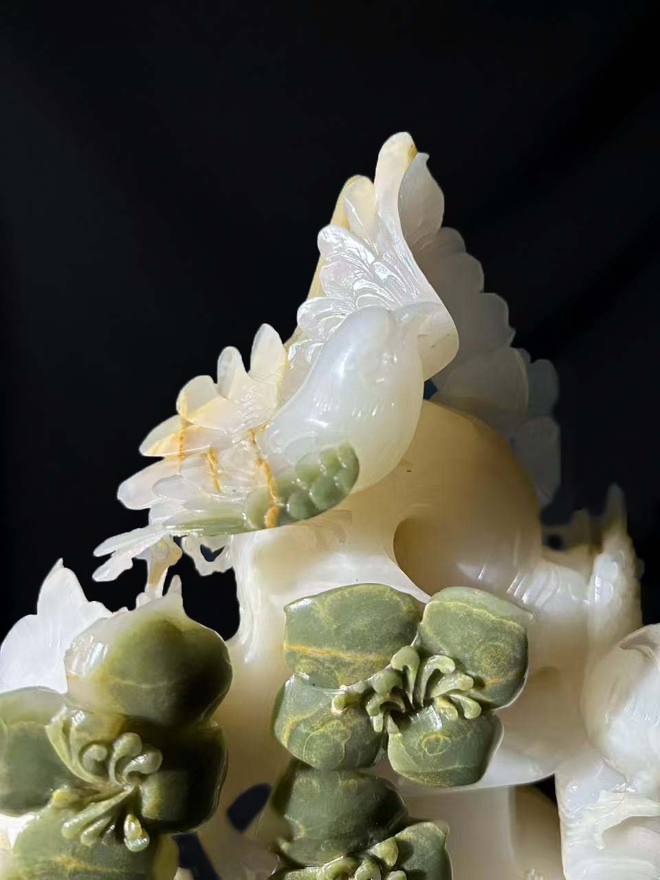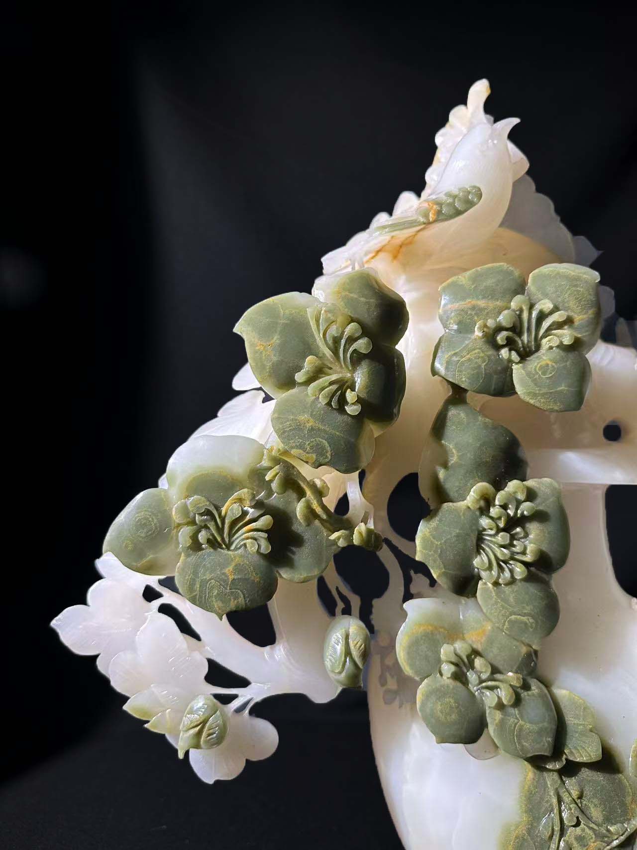 花朵的花瓣纹理、飞鸟的姿态都刻画得栩栩如生,体现了玉雕师对细节的精准把控和对自然形态的生动还原。