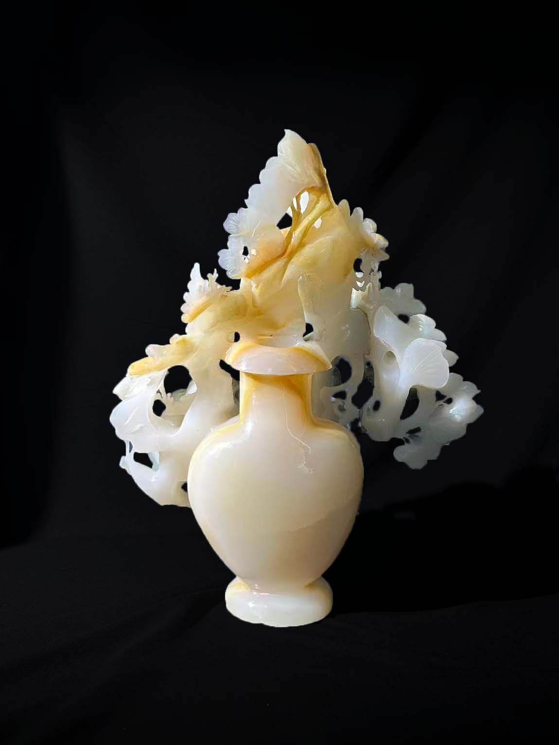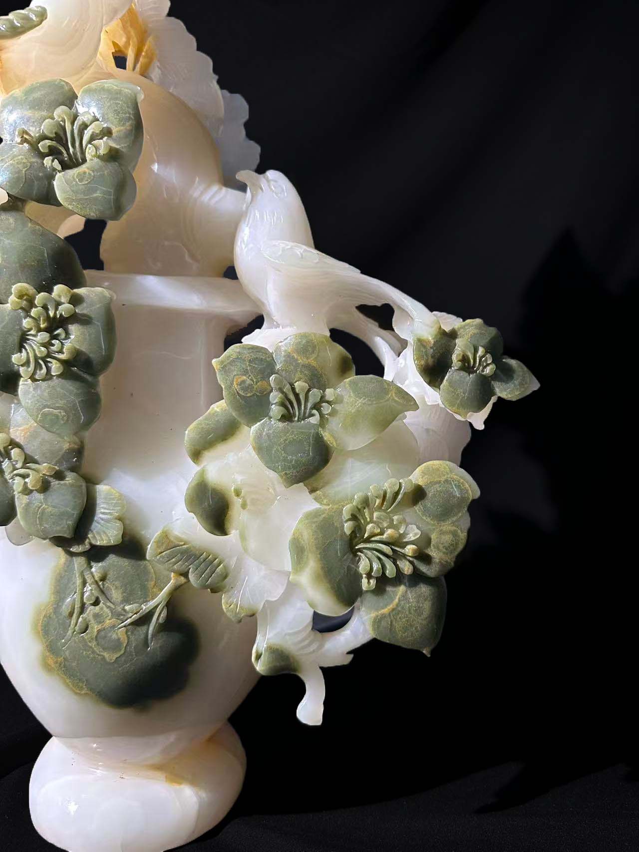 结合的技法,将玉料的白、绿两色巧妙利用:绿色部分雕琢成盛开的花朵、枝叶,白色部分塑造花瓶主体与飞鸟,工艺细腻,层次分明。