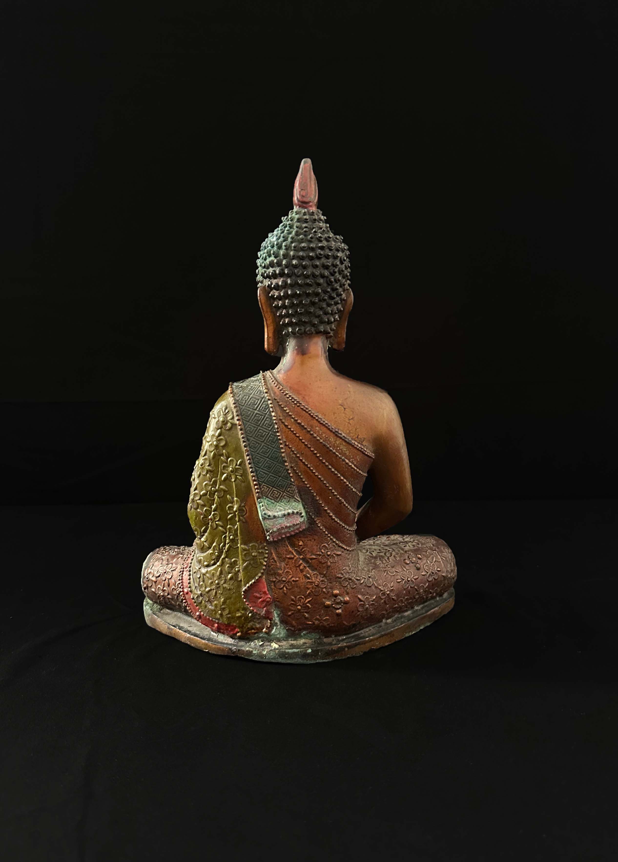 表面采用彩绘工艺,袈裟装饰有花纹、几何纹样镶边,