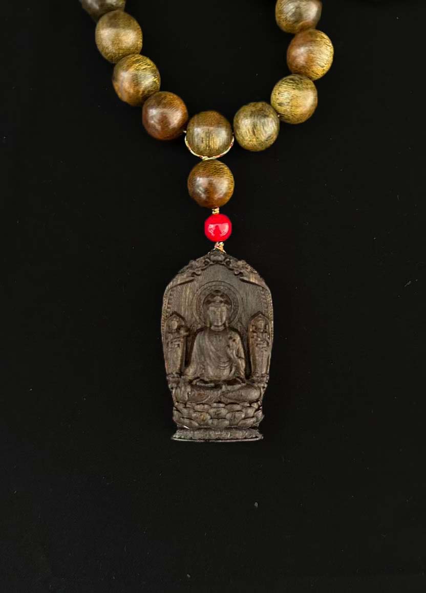 金丝绿结 特征:指沉香木中带有金丝状纹理 + 绿褐色结香的品相,是登流眉沉香的优质品类之一吊坠为沉香精雕佛像,细节刻画清晰,体现了手工雕刻的质感,保留了沉香的天然肌理。仅供参考 自行甄别